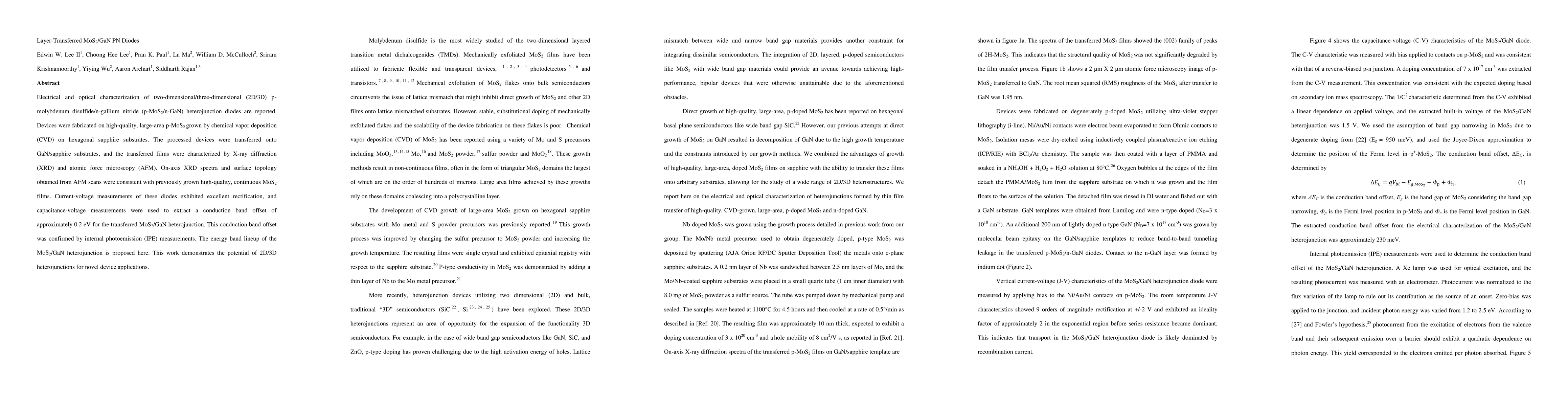 This paper reports the fabrication and characterization of p-MoS2/n-GaN PN diodes, showing excellent rectification and a conduction band offset of 0.2 eV. The study highlights the potential of 2D/3D heterojunctions for advanced electronic and optoelectronic devices.