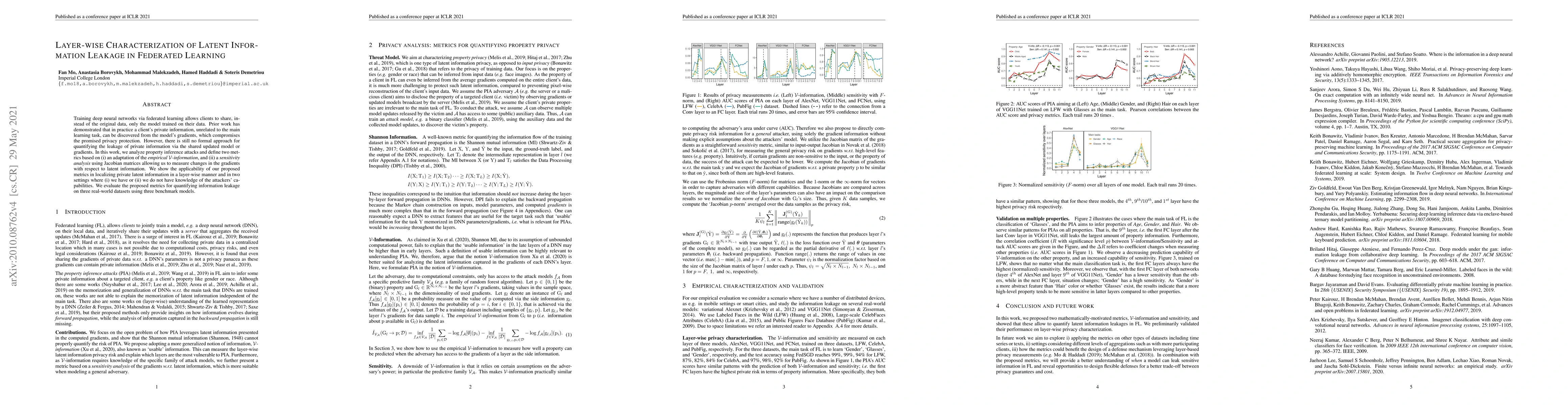 This paper proposes two metrics to quantify latent information leakage in federated learning, analyzing property inference attacks through an adaptation of the empirical $\mathcal{V}$-information and sensitivity analysis using Jacobian matrices. The metrics are evaluated on three datasets to demonstrate their effectiveness in localizing private information in a layer-wise manner.