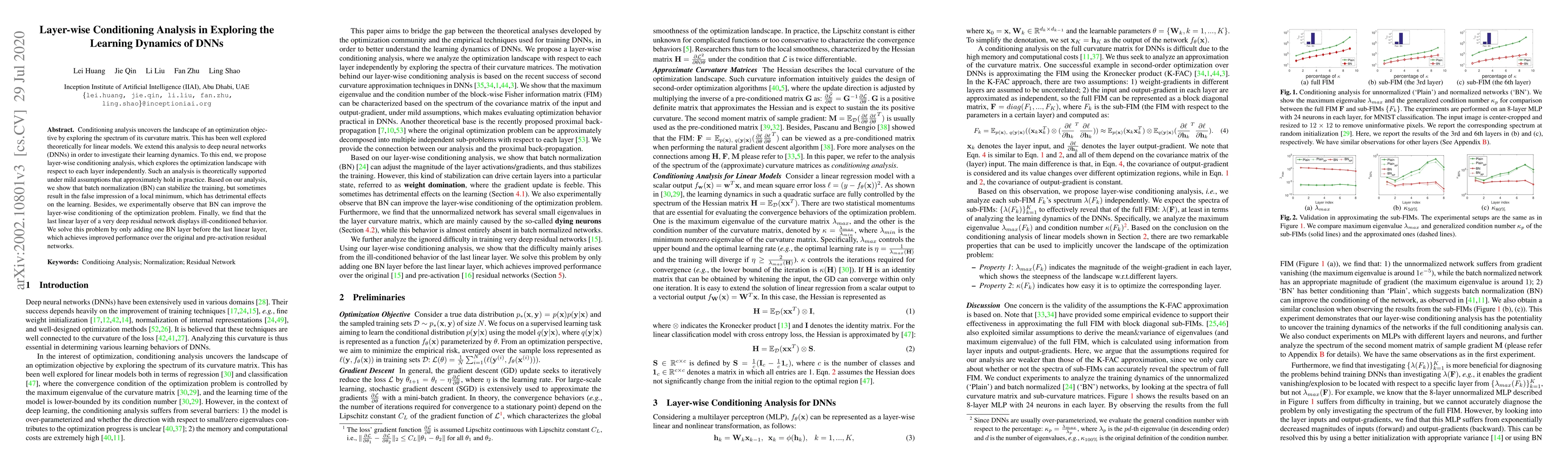 Conditioning analysis uncovers the landscape of an optimization objective by exploring the spectrum of its curvature matrix. This has been well explored theoretically for linear models. We extend this analysis to deep neural networks (DNNs) in order to investigate their learning dynamics. To this end, we propose layer-wise conditioning analysis, which explores the optimization landscape with respect to each layer independently. Such an analysis is theoretically supported under mild assumptions that approximately hold in practice. Based on our analysis, we show that batch normalization (BN) can stabilize the training, but sometimes result in the false impression of a local minimum, which has detrimental effects on the learning. Besides, we experimentally observe that BN can improve the layer-wise conditioning of the optimization problem. Finally, we find that the last linear layer of a very deep residual network displays ill-conditioned behavior. We solve this problem by only adding one BN layer before the last linear layer, which achieves improved performance over the original and pre-activation residual networks.