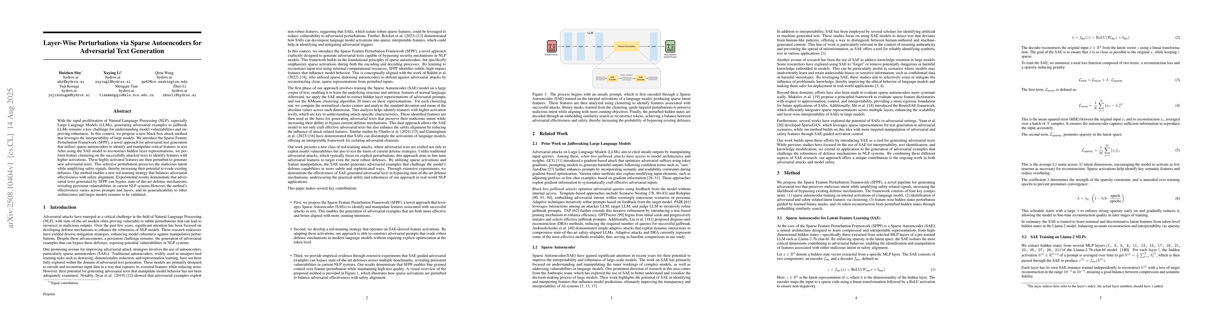 With the rapid proliferation of Natural Language Processing (NLP), especially Large Language Models (LLMs), generating adversarial examples to jailbreak LLMs remains a key challenge for understanding model vulnerabilities and improving robustness. In this context, we propose a new black-box attack method that leverages the interpretability of large models. We introduce the Sparse Feature Perturbation Framework (SFPF), a novel approach for adversarial text generation that utilizes sparse autoencoders to identify and manipulate critical features in text. After using the SAE model to reconstruct hidden layer representations, we perform feature clustering on the successfully attacked texts to identify features with higher activations. These highly activated features are then perturbed to generate new adversarial texts. This selective perturbation preserves the malicious intent while amplifying safety signals, thereby increasing their potential to evade existing defenses. Our method enables a new red-teaming strategy that balances adversarial effectiveness with safety alignment. Experimental results demonstrate that adversarial texts generated by SFPF can bypass state-of-the-art defense mechanisms, revealing persistent vulnerabilities in current NLP systems.However, the method's effectiveness varies across prompts and layers, and its generalizability to other architectures and larger models remains to be validated.