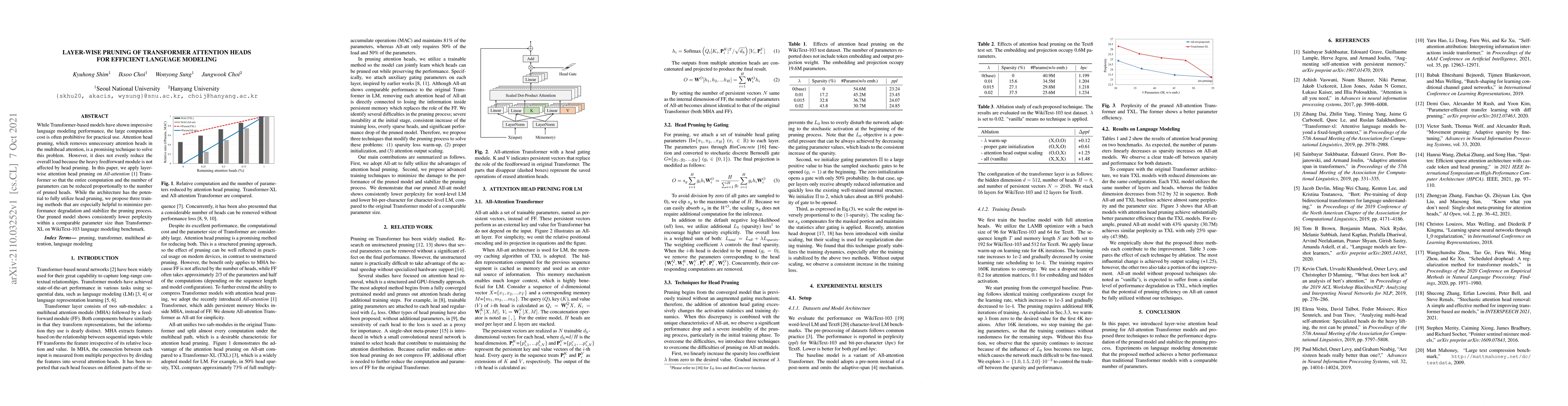 This paper proposes layer-wise pruning of attention heads in Transformer models to reduce computational costs while maintaining or improving language modeling performance. It introduces three training methods to stabilize pruning and demonstrates that the pruned model achieves lower perplexity compared to Transformer-XL on the WikiText-103 benchmark.