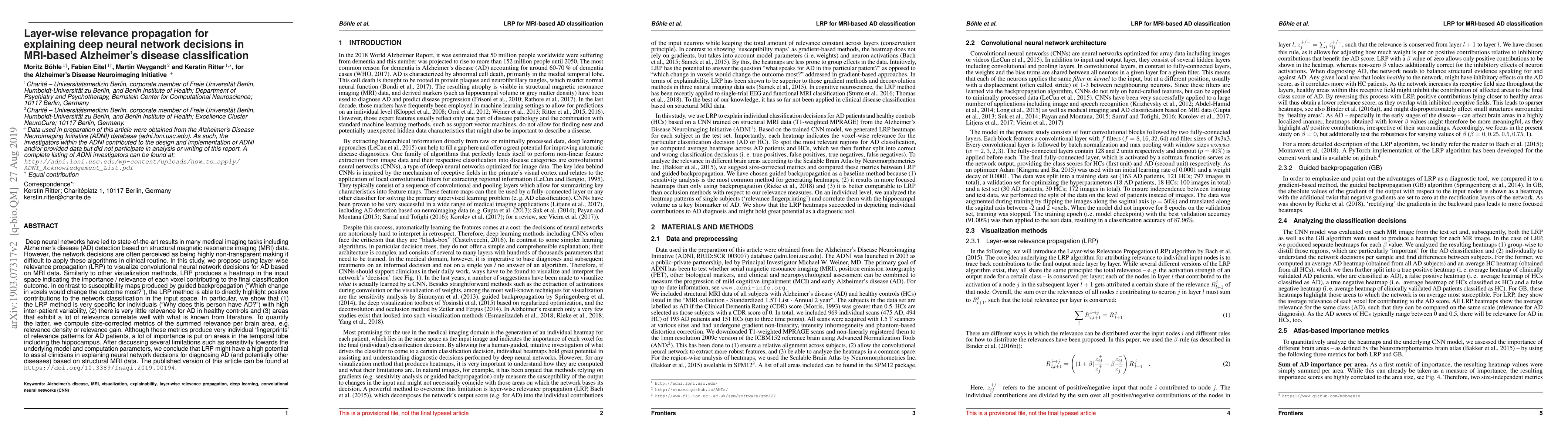 This paper proposes using layer-wise relevance propagation (LRP) to explain deep neural network decisions for Alzheimer's disease classification based on MRI data. LRP highlights specific voxel contributions to the network's classification, revealing high inter-patient variability and areas of relevance in the temporal lobe, particularly the hippocampus, which correlate well with known AD markers.