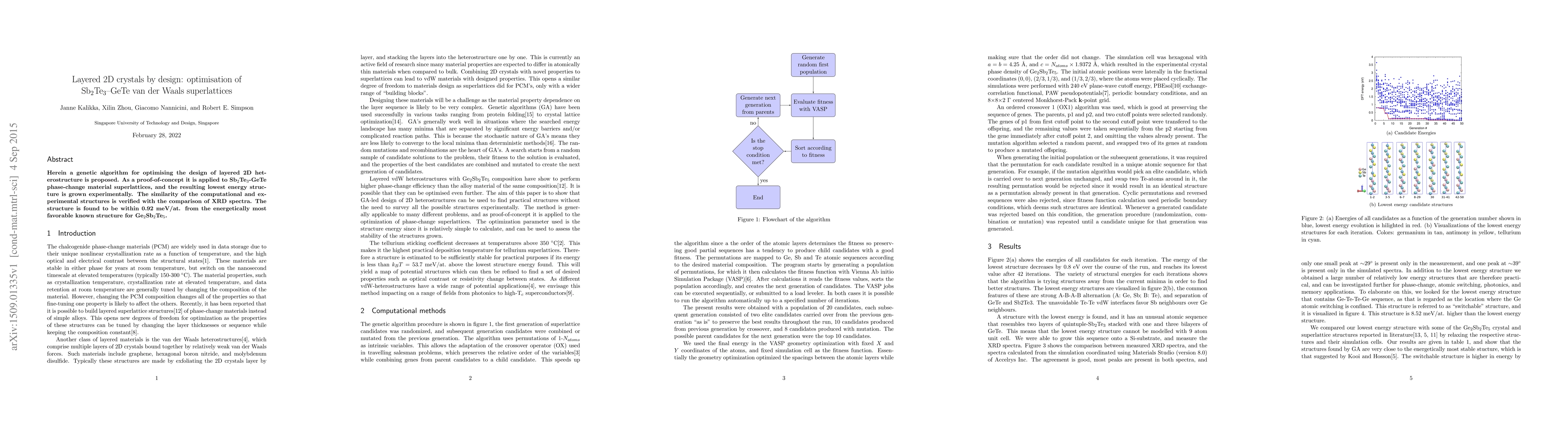 The paper proposes a genetic algorithm to optimize the design of layered 2D heterostructures, applying it to Sb$_2$Te$_3$-GeTe superlattices, and successfully grows the optimized structure experimentally, showing a close match to the most favorable known structure for Ge$_2$Sb$_2$Te$_5$ by comparing XRD spectra.