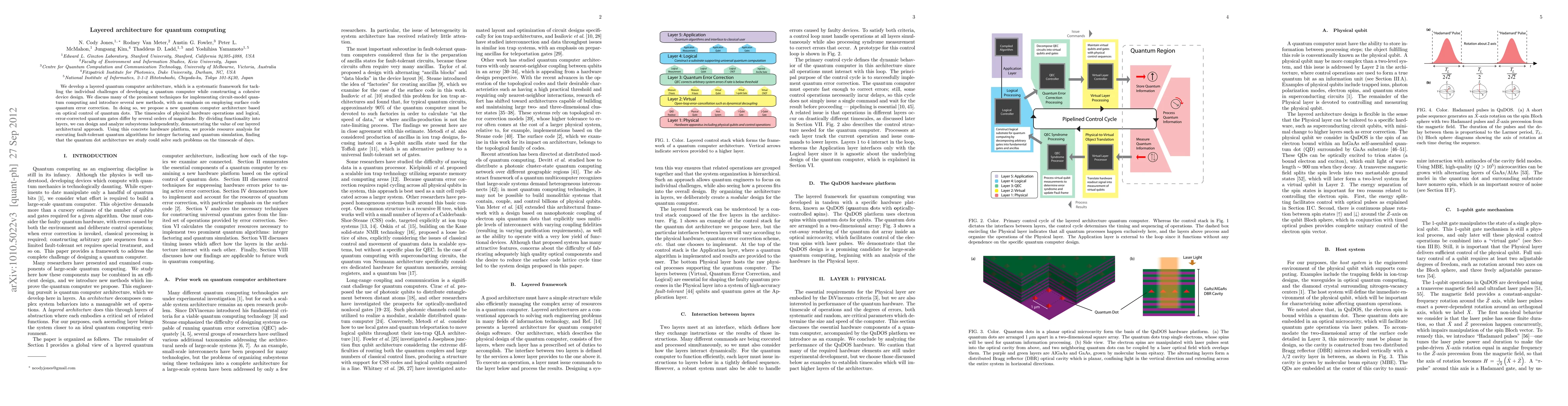 We develop a layered quantum computer architecture, which is a systematic framework for tackling the individual challenges of developing a quantum computer while constructing a cohesive device design. We discuss many of the prominent techniques for implementing circuit-model quantum computing and introduce several new methods, with an emphasis on employing surface code quantum error correction. In doing so, we propose a new quantum computer architecture based on optical control of quantum dots. The timescales of physical hardware operations and logical, error-corrected quantum gates differ by several orders of magnitude. By dividing functionality into layers, we can design and analyze subsystems independently, demonstrating the value of our layered architectural approach. Using this concrete hardware platform, we provide resource analysis for executing fault-tolerant quantum algorithms for integer factoring and quantum simulation, finding that the quantum dot architecture we study could solve such problems on the timescale of days.