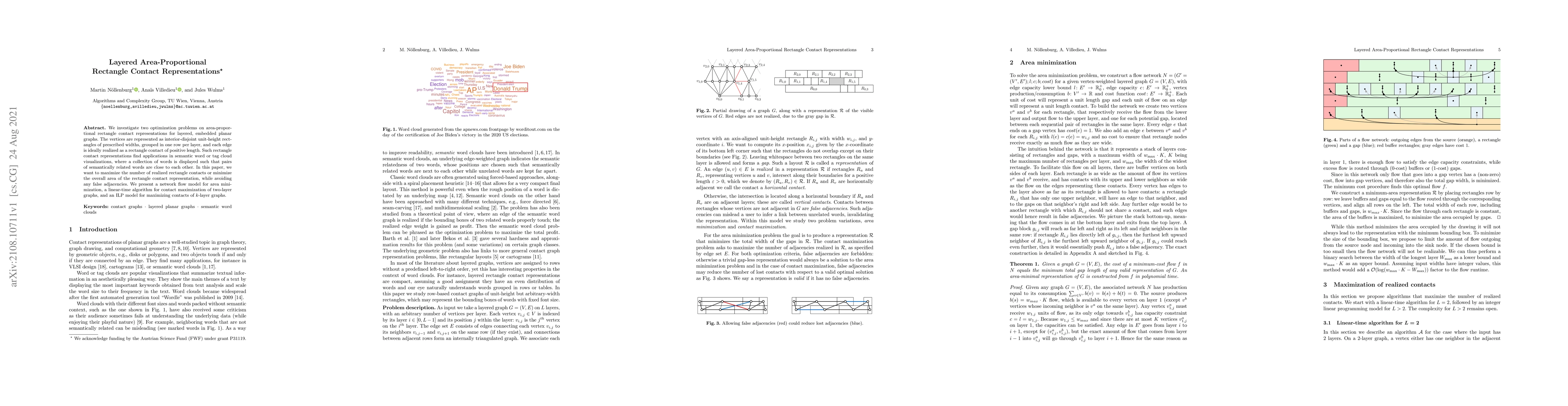 We investigate two optimization problems on area-proportional rectangle contact representations for layered, embedded planar graphs. The vertices are represented as interior-disjoint unit-height rectangles of prescribed widths, grouped in one row per layer, and each edge is ideally realized as a rectangle contact of positive length. Such rectangle contact representations find applications in semantic word or tag cloud visualizations, where a collection of words is displayed such that pairs of semantically related words are close to each other. In this paper, we want to maximize the number of realized rectangle contacts or minimize the overall area of the rectangle contact representation, while avoiding any false adjacencies. We present a network flow model for area minimization, a linear-time algorithm for contact maximization of two-layer graphs, and an ILP model for maximizing contacts of $k$-layer graphs.