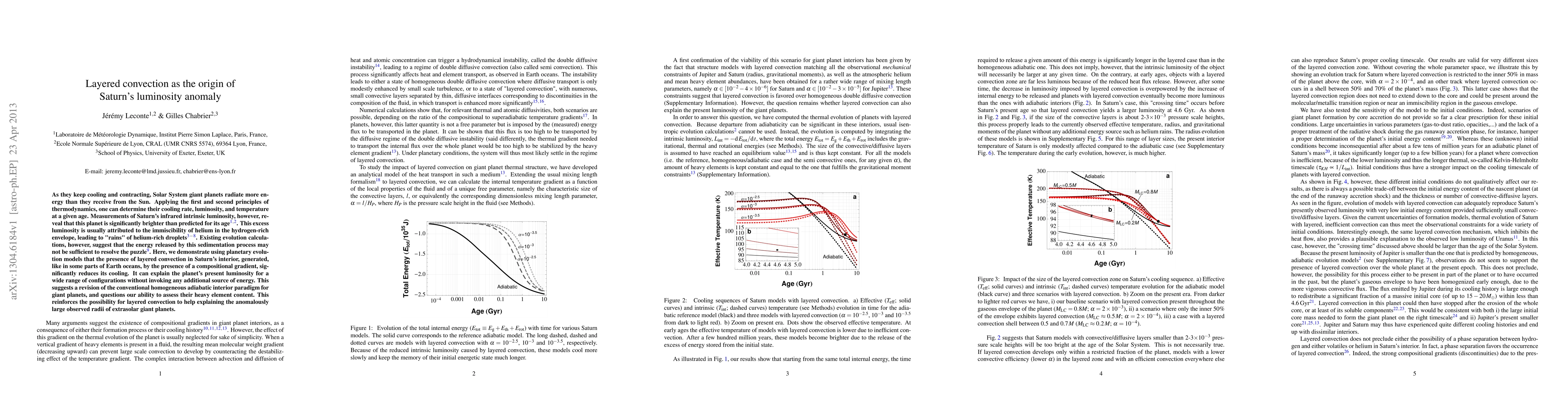 As they keep cooling and contracting, Solar System giant planets radiate more energy than they receive from the Sun. Applying the first and second principles of thermodynamics, one can determine their cooling rate, luminosity, and temperature at a given age. Measurements of Saturn's infrared intrinsic luminosity, however, reveal that this planet is significantly brighter than predicted for its age. This excess luminosity is usually attributed to the immiscibility of helium in the hydrogen-rich envelope, leading to "rains" of helium-rich droplets. Existing evolution calculations, however, suggest that the energy released by this sedimentation process may not be sufficient to resolve the puzzle. Here, we demonstrate using planetary evolution models that the presence of layered convection in Saturn's interior, generated, like in some parts of Earth oceans, by the presence of a compositional gradient, significantly reduces its cooling. It can explain the planet's present luminosity for a wide range of configurations without invoking any additional source of energy. This suggests a revision of the conventional homogeneous adiabatic interior paradigm for giant planets, and questions our ability to assess their heavy element content. This reinforces the possibility for layered convection to help explaining the anomalously large observed radii of extrasolar giant planets.