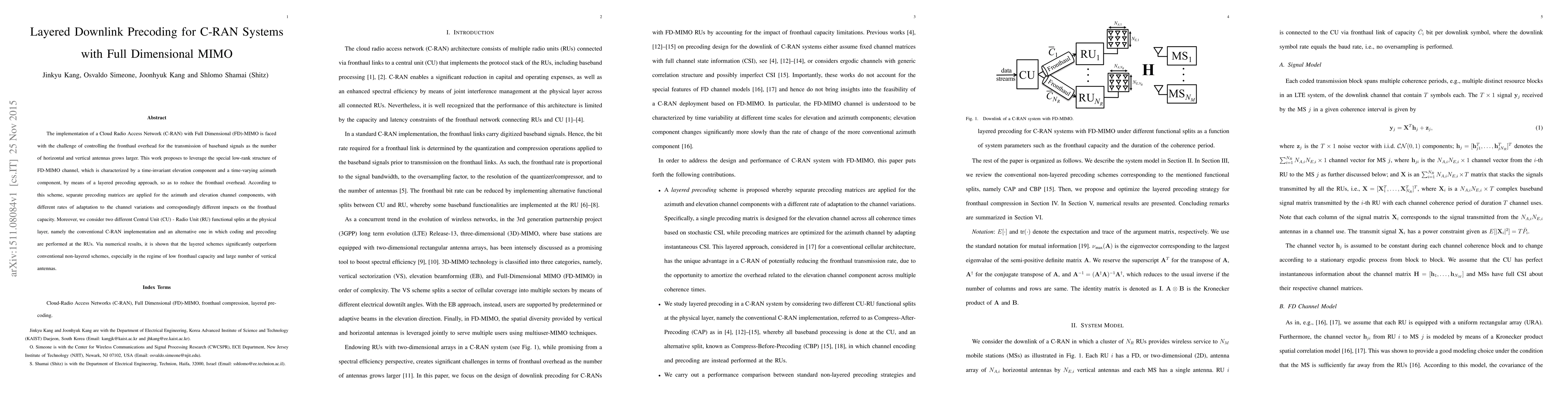 The implementation of a Cloud Radio Access Network (C-RAN) with Full Dimensional (FD)-MIMO is faced with the challenge of controlling the fronthaul overhead for the transmission of baseband signals as the number of horizontal and vertical antennas grows larger. This work proposes to leverage the special low-rank structure of FD-MIMO channel, which is characterized by a time-invariant elevation component and a time-varying azimuth component, by means of a layered precoding approach, so as to reduce the fronthaul overhead. According to this scheme, separate precoding matrices are applied for the azimuth and elevation channel components, with different rates of adaptation to the channel variations and correspondingly different impacts on the fronthaul capacity. Moreover, we consider two different Central Unit (CU) - Radio Unit (RU) functional splits at the physical layer, namely the conventional C-RAN implementation and an alternative one in which coding and precoding are performed at the RUs. Via numerical results, it is shown that the layered schemes significantly outperform conventional non-layered schemes, especially in the regime of low fronthaul capacity and large number of vertical antennas.