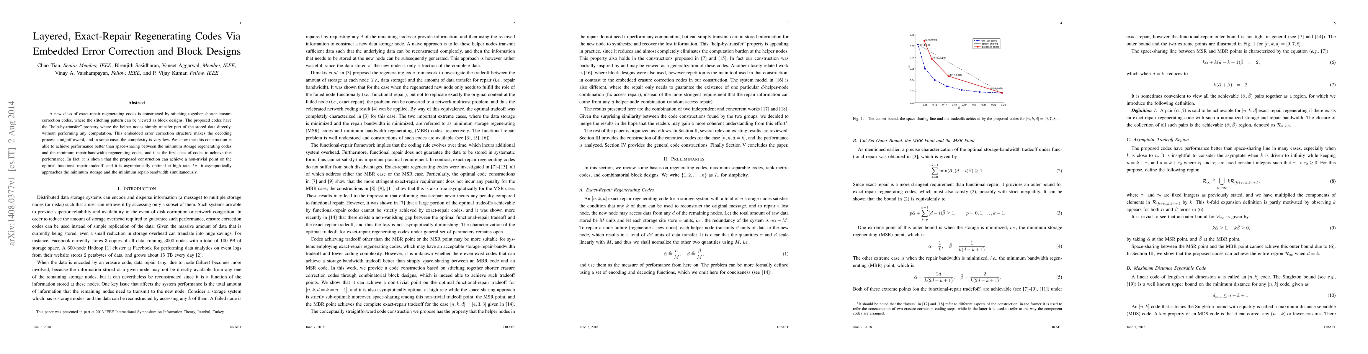 This paper introduces a new class of exact-repair regenerating codes constructed using embedded error correction and block designs, achieving better performance than space-sharing methods. The proposed codes enable "help-by-transfer" with low complexity, and are asymptotically optimal at high rates.