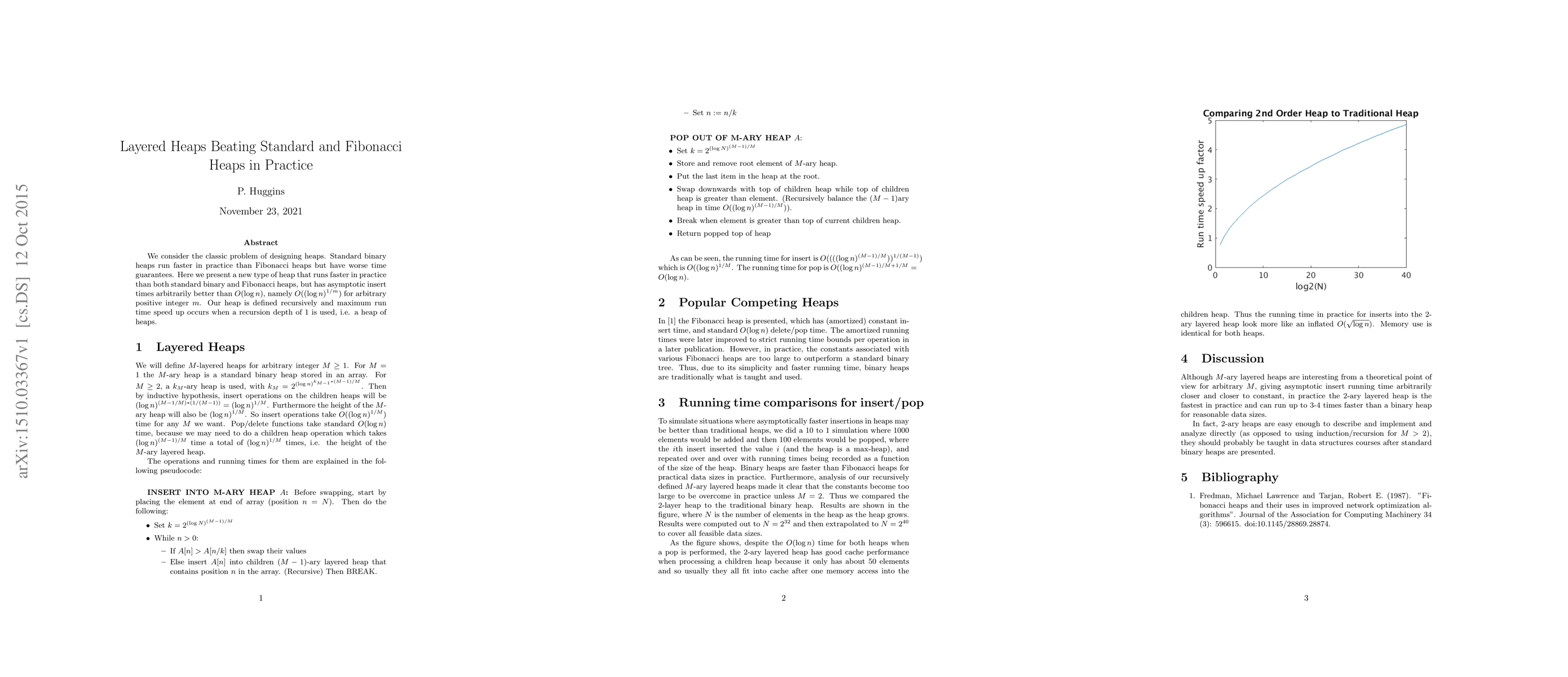 Summary: Layered heaps outperform both standard binary and Fibonacci heaps in practical scenarios, achieving faster runtimes while offering better asymptotic insert times compared to binary heaps. The optimal performance is achieved with a recursion depth of 1, essentially creating a "heap of heaps."