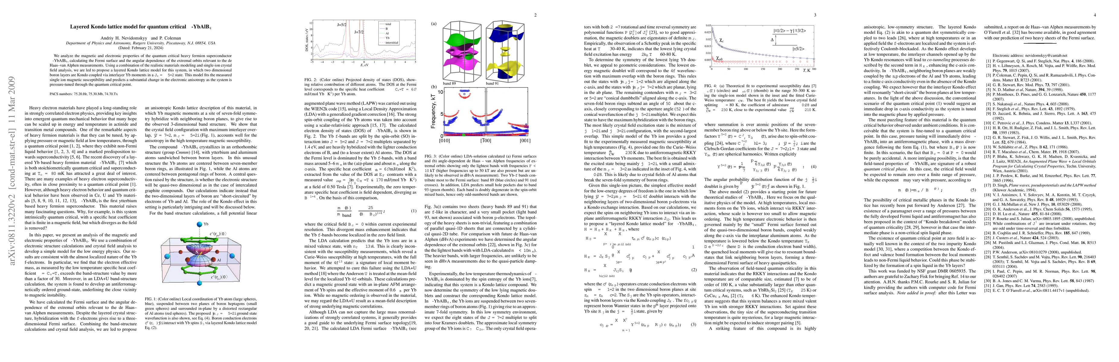 We analyze the magnetic and electronic properties of the quantum critical heavy fermion superconductor beta-YbAlB4, calculating the Fermi surface and the angular dependence of the extremal orbits relevant to the de Haas--van Alphen measurements. Using a combination of the realistic materials modeling and single-ion crystal field analysis, we are led to propose a layered Kondo lattice model for this system, in which two dimensional boron layers are Kondo coupled via interlayer Yb moments in a $J_{z}=\pm 5/2$ state. This model fits the measured single ion magnetic susceptibility and predicts a substantial change in the electronic anisotropy as the system is pressure-tuned through the quantum critical point.