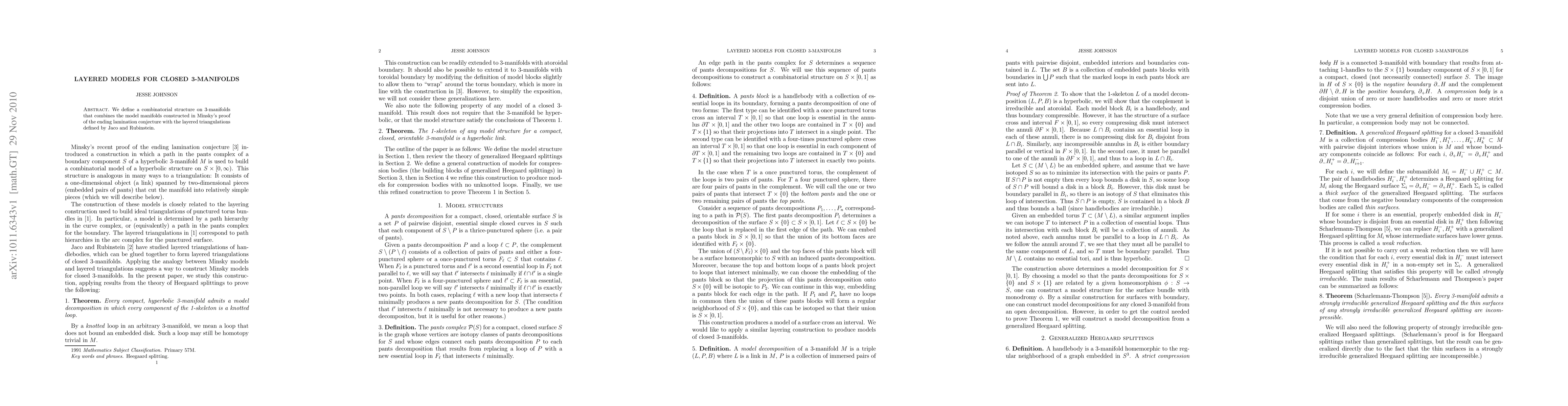 This paper introduces a combinatorial structure on 3-manifolds by integrating Minsky's model manifolds from the ending lamination conjecture with Jaco and Rubinstein's layered triangulations, aiming to advance understanding of closed 3-manifolds.