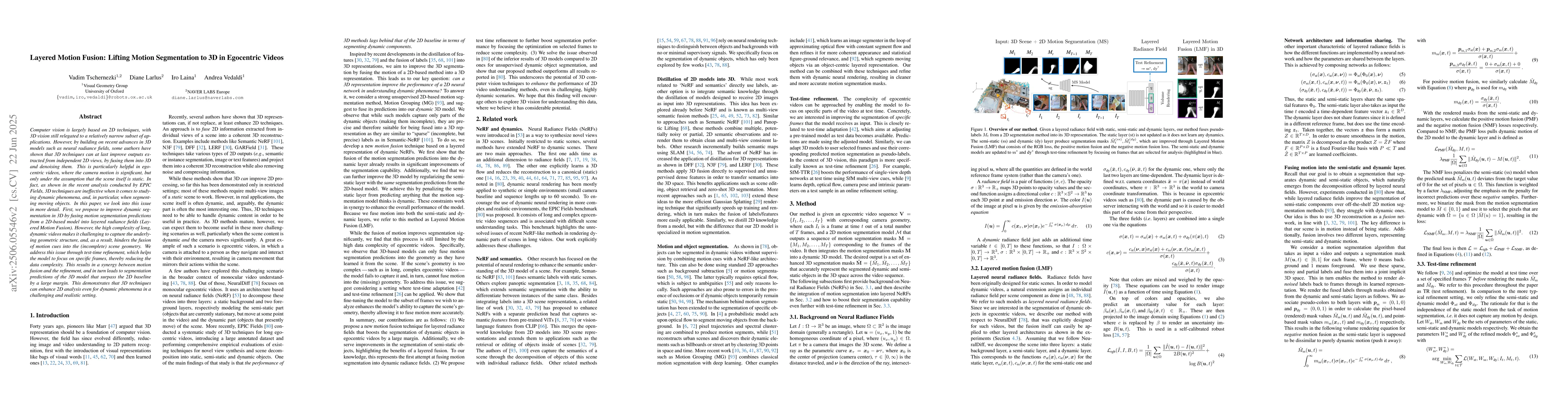 Computer vision is largely based on 2D techniques, with 3D vision still relegated to a relatively narrow subset of applications. However, by building on recent advances in 3D models such as neural radiance fields, some authors have shown that 3D techniques can at last improve outputs extracted from independent 2D views, by fusing them into 3D and denoising them. This is particularly helpful in egocentric videos, where the camera motion is significant, but only under the assumption that the scene itself is static. In fact, as shown in the recent analysis conducted by EPIC Fields, 3D techniques are ineffective when it comes to studying dynamic phenomena, and, in particular, when segmenting moving objects. In this paper, we look into this issue in more detail. First, we propose to improve dynamic segmentation in 3D by fusing motion segmentation predictions from a 2D-based model into layered radiance fields (Layered Motion Fusion). However, the high complexity of long, dynamic videos makes it challenging to capture the underlying geometric structure, and, as a result, hinders the fusion of motion cues into the (incomplete) scene geometry. We address this issue through test-time refinement, which helps the model to focus on specific frames, thereby reducing the data complexity. This results in a synergy between motion fusion and the refinement, and in turn leads to segmentation predictions of the 3D model that surpass the 2D baseline by a large margin. This demonstrates that 3D techniques can enhance 2D analysis even for dynamic phenomena in a challenging and realistic setting.