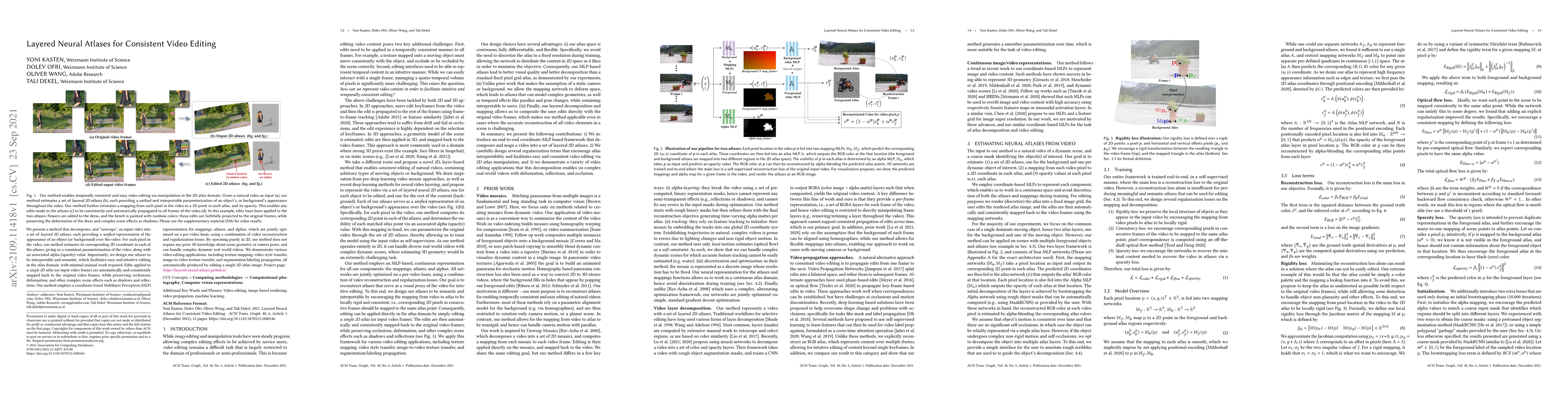 This paper introduces a method for decomposing videos into layered 2D atlases that provide a consistent representation of objects and backgrounds, enabling intuitive editing with minimal manual intervention. The method maps edits back to original video frames while preserving complex scene effects, using a coordinate-based MLP representation optimized via video reconstruction and regularization losses.