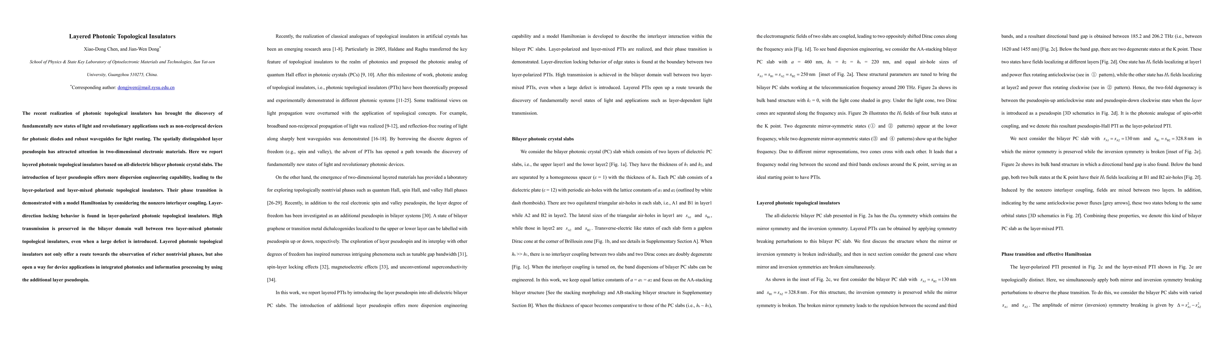 This paper reports on the development of layered photonic topological insulators utilizing all-dielectric bilayer photonic crystal slabs, showcasing enhanced dispersion engineering through layer pseudospin. These structures demonstrate robust transmission and potential for advanced integrated photonic devices.