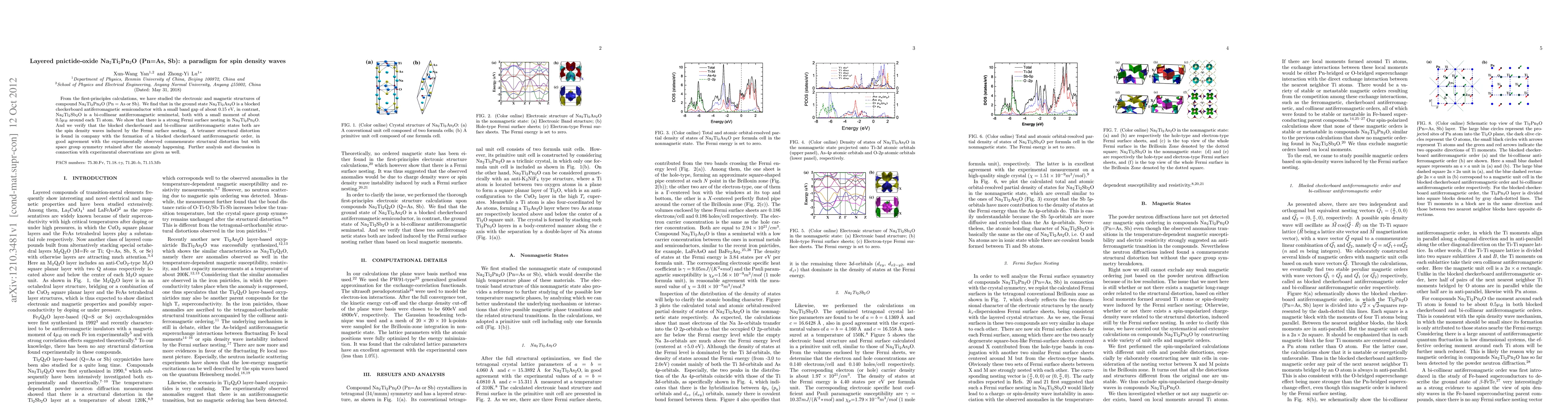 From the first-principles calculations, we have studied the electronic and magnetic structures of compound Na$_2$Ti$_2$Pn$_2$O (Pn = As or Sb). We find that in the ground state Na$_2$Ti$_2$As$_2$O is a blocked checkerboard antiferromagnetic semiconductor with a small band gap of about 0.15 eV, in contrast, Na$_2$Ti$_2$Sb$_2$O is a bi-collinear antiferromagnetic semimetal, both with a small moment of about 0.5$\mu_B$ around each Ti atom. We show that there is a strong Fermi surface nesting in Na$_2$Ti$_2$Pn$_2$O. And we verify that the blocked checkerboard and bi-collinear antiferromagnetic states both are the spin density waves induced by the Fermi surface nesting. A tetramer structural distortion is found in company with the formation of a blocked checkerboard antiferromagnetic order, in good agreement with the experimentally observed commensurate structural distortion but with space group symmetry retained after the anomaly happening. Further analysis and discussion in connection with experimental observations are given as well.