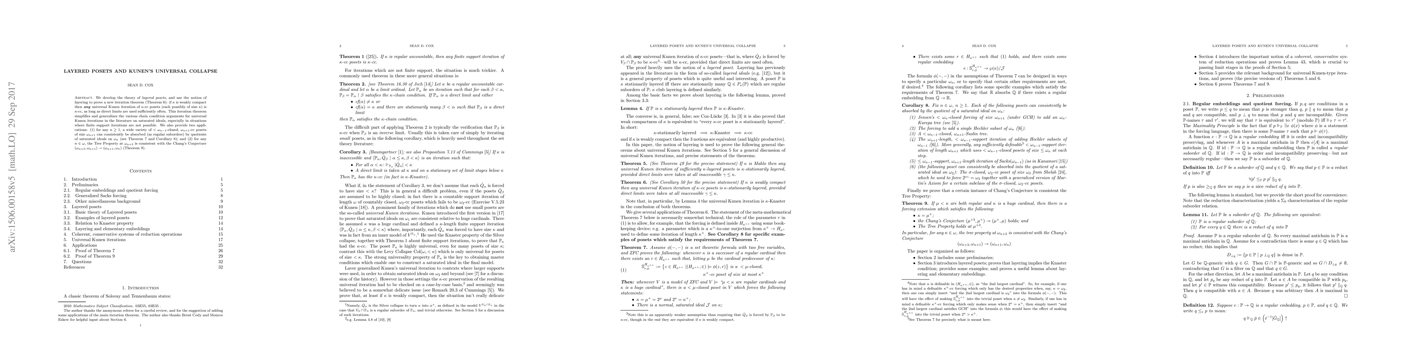 We develop the theory of layered posets, and use the notion of layering to prove a new iteration theorem (Theorem 6): if $\kappa$ is weakly compact then any universal Kunen iteration of $\kappa$-cc posets (each possibly of size $\kappa$) is $\kappa$-cc, as long as direct limits are used sufficiently often. This iteration theorem simplifies and generalizes the various chain condition arguments for universal Kunen iterations in the literature on saturated ideals, especially in situations where finite support iterations are not possible. We also provide two applications: (1) For any $n \ge 1$, a wide variety of $<\omega_{n-1}$-closed, $\omega_{n+1}$-cc posets of size $\omega_{n+1}$ can consistently be absorbed (as regular suborders) by quotients of saturated ideals on $\omega_n$ (see Theorem 7 and Corollary 8); and (2) For any $n \in \omega$, the Tree Property at $\omega_{n+3}$ is consistent with the Chang's Conjecture $(\omega_{n+3}, \omega_{n+1}) \twoheadrightarrow (\omega_{n+1}, \omega_n)$ (Theorem 9).