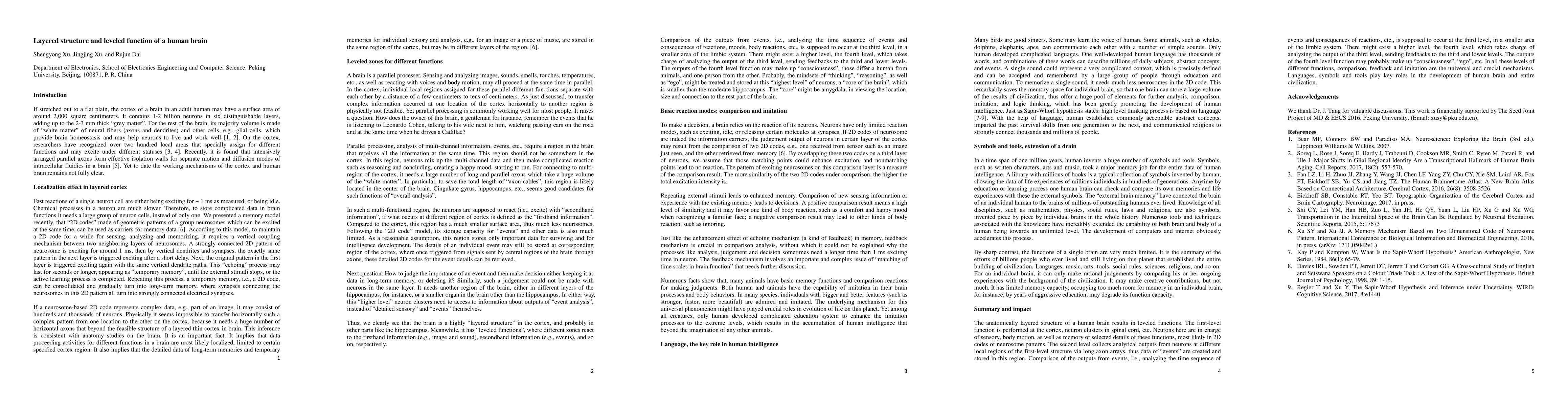 The anatomically layered structure of a human brain results in leveled functions. In all these levels of different functions, comparison, feedback and imitation are the universal and crucial mechanisms. Languages, symbols and tools play key roles in the development of human brain and entire civilization.