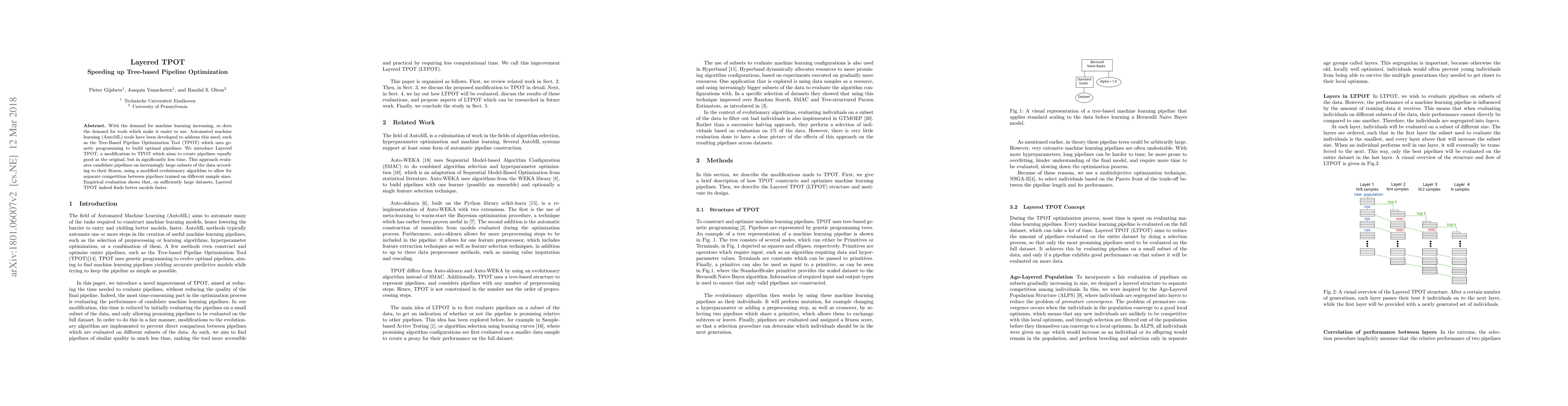 With the demand for machine learning increasing, so does the demand for tools which make it easier to use. Automated machine learning (AutoML) tools have been developed to address this need, such as the Tree-Based Pipeline Optimization Tool (TPOT) which uses genetic programming to build optimal pipelines. We introduce Layered TPOT, a modification to TPOT which aims to create pipelines equally good as the original, but in significantly less time. This approach evaluates candidate pipelines on increasingly large subsets of the data according to their fitness, using a modified evolutionary algorithm to allow for separate competition between pipelines trained on different sample sizes. Empirical evaluation shows that, on sufficiently large datasets, Layered TPOT indeed finds better models faster.