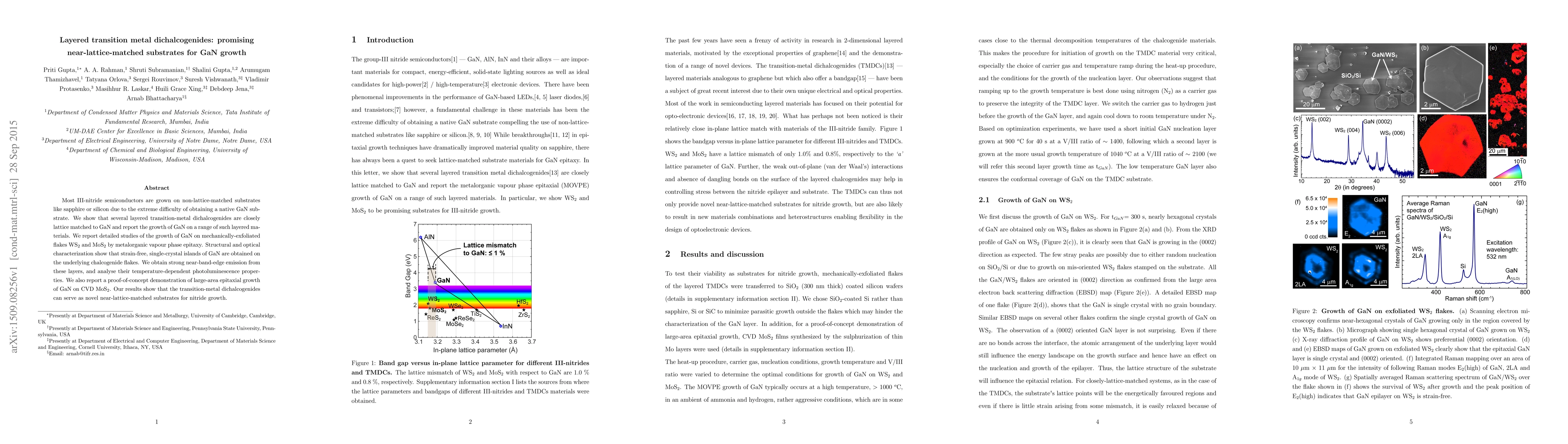 This paper demonstrates that layered transition metal dichalcogenides like WS$_2$ and MoS$_2$ can serve as near-lattice-matched substrates for growing GaN, achieving strain-free, single-crystal GaN islands with strong near-band-edge emission. The study also presents a proof-of-concept for large-area epitaxial GaN growth on CVD MoS$_2$.