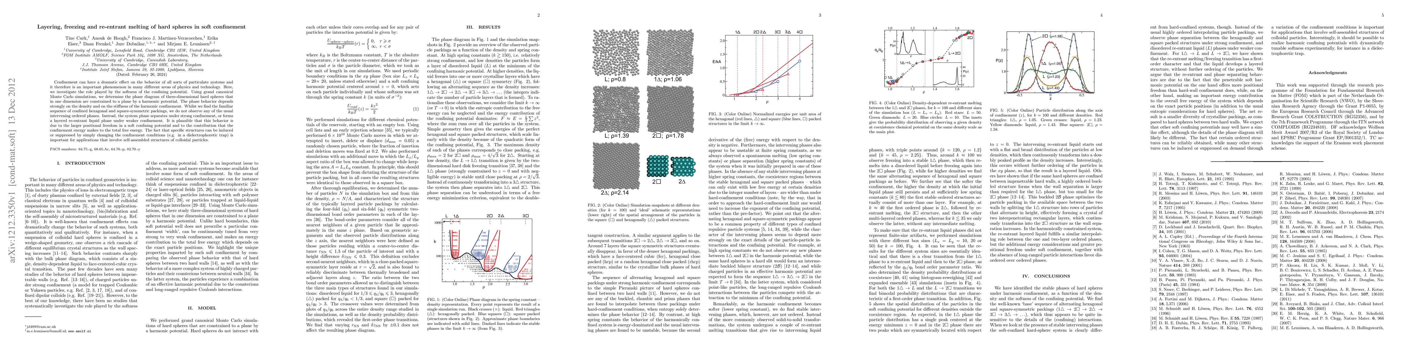 Confinement can have a dramatic effect on the behavior of all sorts of particulate systems and it therefore is an important phenomenon in many different areas of physics and technology. Here, we investigate the role played by the softness of the confining potential. Using grand canonical Monte Carlo simulations, we determine the phase diagram of three-dimensional hard spheres that in one dimension are constrained to a plane by a harmonic potential. The phase behavior depends strongly on the density and on the stiffness of the harmonic confinement. Whilst we find the familiar sequence of confined hexagonal and square-symmetric packings, we do not observe any of the usual intervening ordered phases. Instead, the system phase separates under strong confinement, or forms a layered re-entrant liquid phase under weaker confinement. It is plausible that this behavior is due to the larger positional freedom in a soft confining potential and to the contribution that the confinement energy makes to the total free energy. The fact that specific structures can be induced or suppressed by simply changing the confinement conditions (e.g. in a dielectrophoretic trap) is important for applications that involve self-assembled structures of colloidal particles.