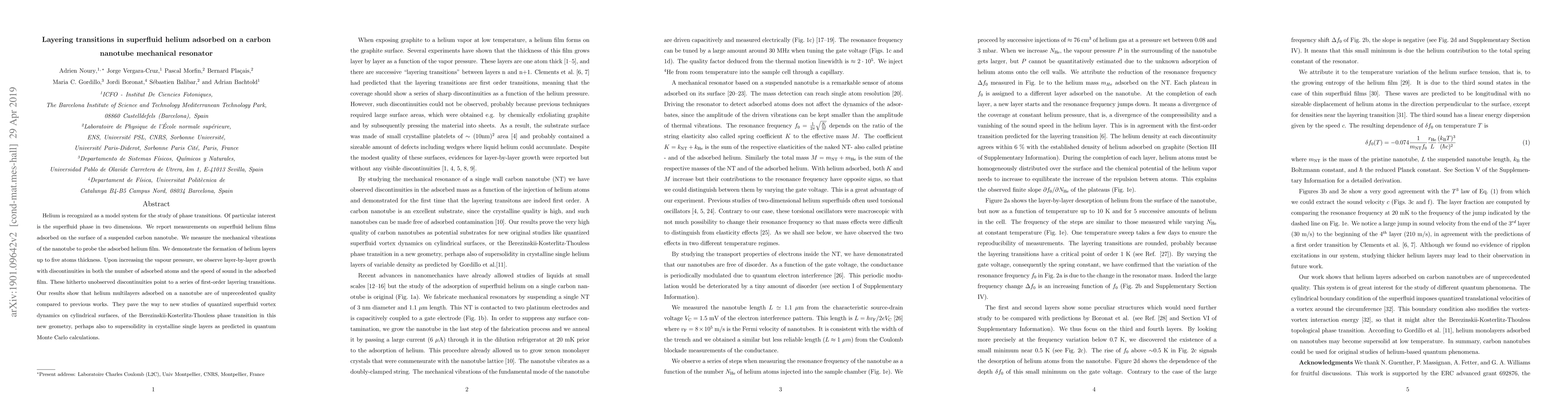 This paper investigates superfluid helium films on a carbon nanotube mechanical resonator, revealing the formation of high-quality helium layers up to five atoms thick. The study observes first-order layering transitions with discontinuities in atom count and sound speed, suggesting new avenues for research into superfluid vortex dynamics and phase transitions.
