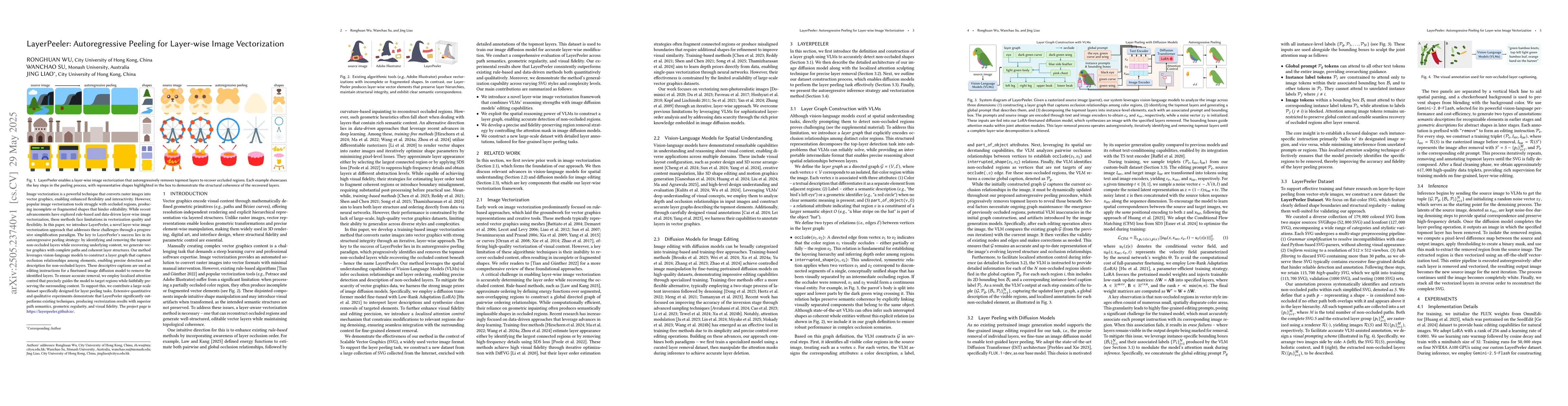 LayerPeeler introduces a novel layer-wise image vectorization approach using an autoregressive peeling strategy. It constructs a layer graph with vision-language models to capture occlusion relationships, then uses a finetuned image diffusion model for precise layer removal, guided by localized attention control.