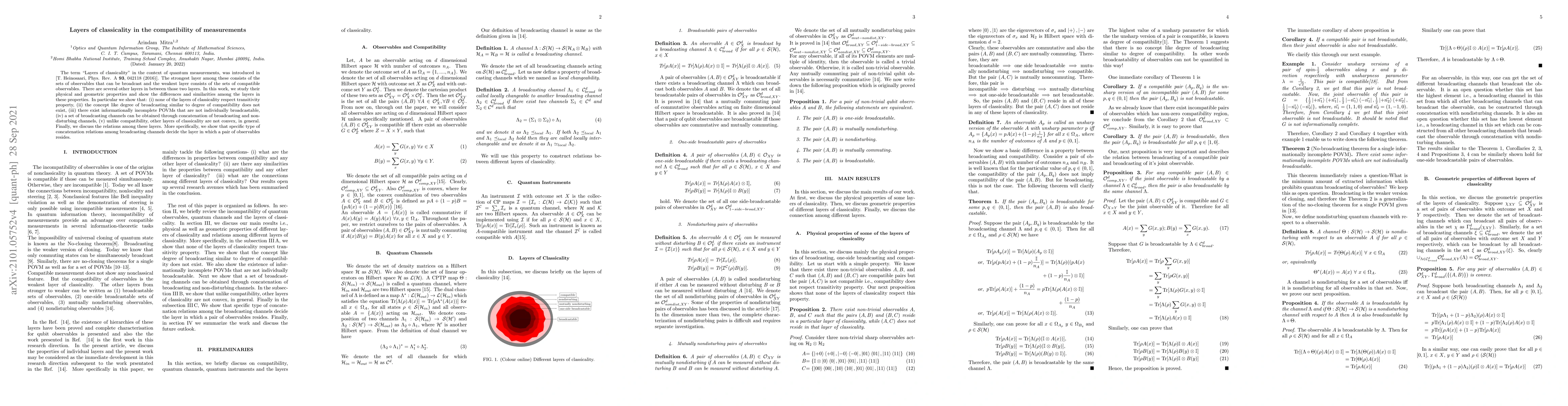 This paper explores the "Layers of classicality" in quantum measurements, examining the physical and geometric properties of different layers of compatibility. It finds that none of these layers respect transitivity, broadcasting channels can be concatenated from simpler channels, and unlike compatibility, other layers are generally non-convex.