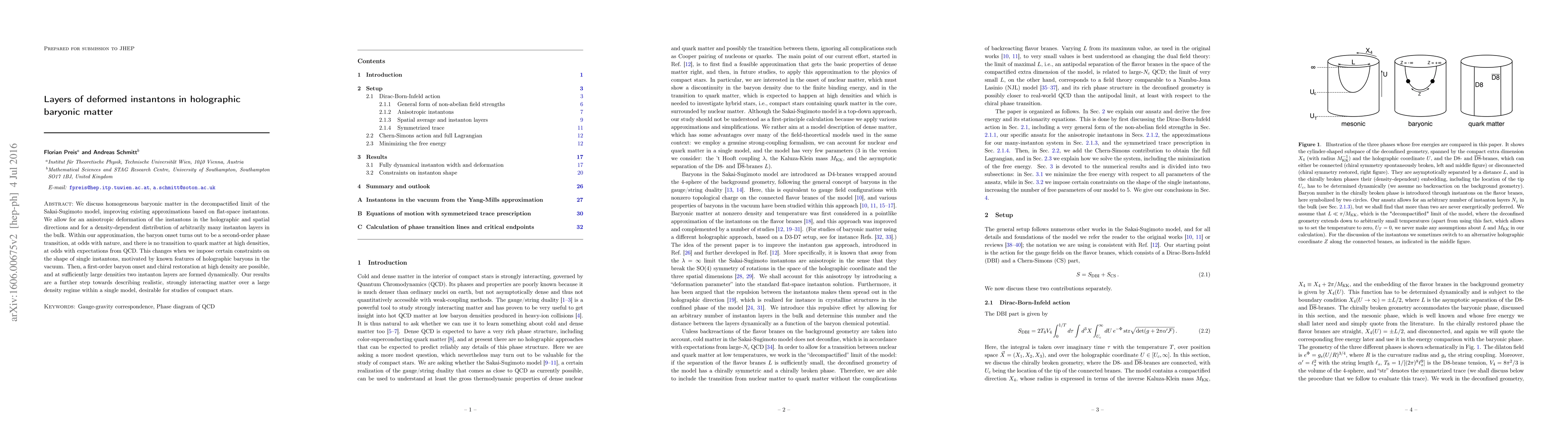 We discuss homogeneous baryonic matter in the decompactified limit of the Sakai-Sugimoto model, improving existing approximations based on flat-space instantons. We allow for an anisotropic deformation of the instantons in the holographic and spatial directions and for a density-dependent distribution of arbitrarily many instanton layers in the bulk. Within our approximation, the baryon onset turns out to be a second-order phase transition, at odds with nature, and there is no transition to quark matter at high densities, at odds with expectations from QCD. This changes when we impose certain constraints on the shape of single instantons, motivated by known features of holographic baryons in the vacuum. Then, a first-order baryon onset and chiral restoration at high density are possible, and at sufficiently large densities two instanton layers are formed dynamically. Our results are a further step towards describing realistic, strongly interacting matter over a large density regime within a single model, desirable for studies of compact stars.