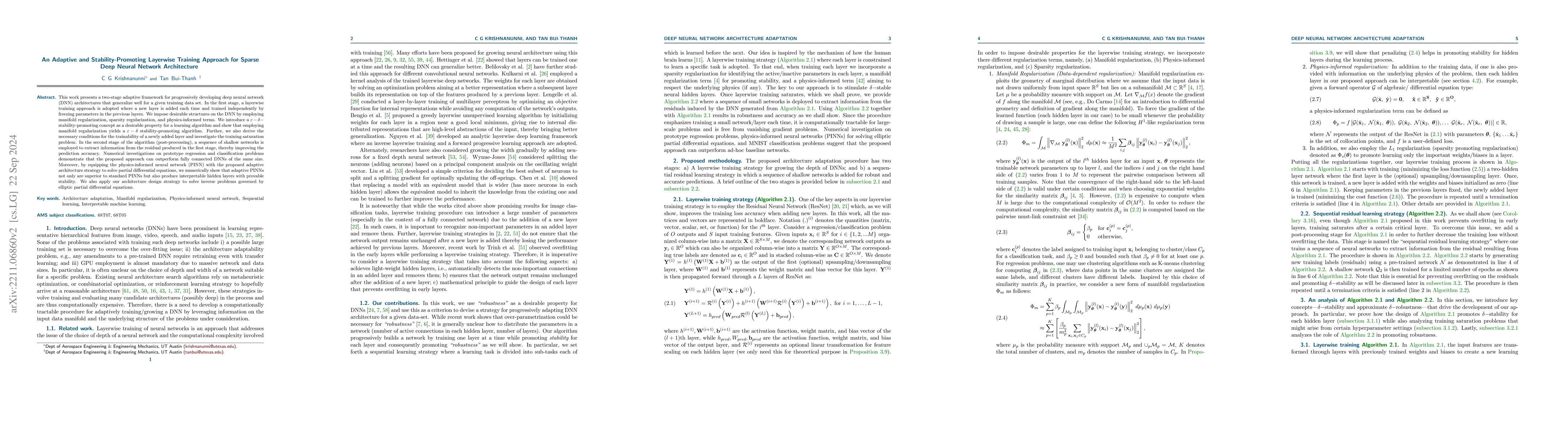 This work presents a two-stage framework for progressively developing neural architectures to adapt/ generalize well on a given training data set. In the first stage, a manifold-regularized layerwise sparsifying training approach is adopted where a new layer is added each time and trained independently by freezing parameters in the previous layers. In order to constrain the functions that should be learned by each layer, we employ a sparsity regularization term, manifold regularization term and a physics-informed term. We derive the necessary conditions for trainability of a newly added layer and analyze the role of manifold regularization. In the second stage of the Algorithm, a sequential learning process is adopted where a sequence of small networks is employed to extract information from the residual produced in stage I and thereby making robust and more accurate predictions. Numerical investigations with fully connected network on prototype regression problem, and classification problem demonstrate that the proposed approach can outperform adhoc baseline networks. Further, application to physics-informed neural network problems suggests that the method could be employed for creating interpretable hidden layers in a deep network while outperforming equivalent baseline networks.