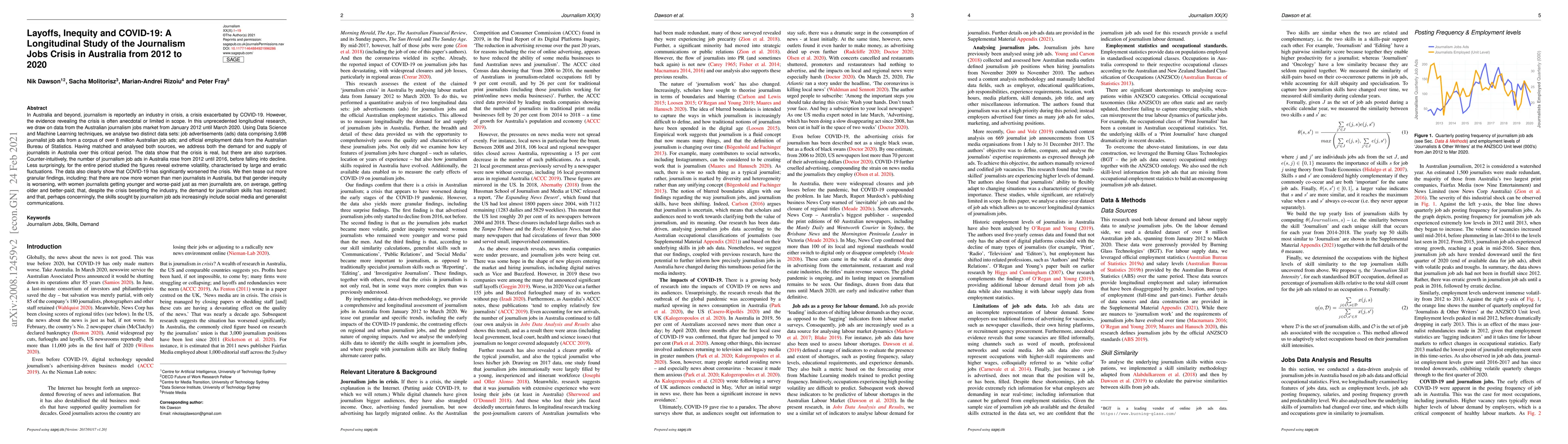 In Australia and beyond, journalism is reportedly an industry in crisis, a crisis exacerbated by COVID-19. However, the evidence revealing the crisis is often anecdotal or limited in scope. In this unprecedented longitudinal research, we draw on data from the Australian journalism jobs market from January 2012 until March 2020. Using Data Science and Machine Learning techniques, we analyse two distinct data sets: job advertisements (ads) data comprising 3,698 journalist job ads from a corpus of over 8 million Australian job ads; and official employment data from the Australian Bureau of Statistics. Having matched and analysed both sources, we address both the demand for and supply of journalists in Australia over this critical period. The data show that the crisis is real, but there are also surprises. Counter-intuitively, the number of journalism job ads in Australia rose from 2012 until 2016, before falling into decline. Less surprisingly, for the entire period studied the figures reveal extreme volatility, characterised by large and erratic fluctuations. The data also clearly show that COVID-19 has significantly worsened the crisis. We then tease out more granular findings, including: that there are now more women than men journalists in Australia, but that gender inequity is worsening, with women journalists getting younger and worse-paid just as men journalists are, on average, getting older and better-paid; that, despite the crisis besetting the industry, the demand for journalism skills has increased; and that, perhaps concerningly, the skills sought by journalism job ads increasingly include social media and generalist communications.