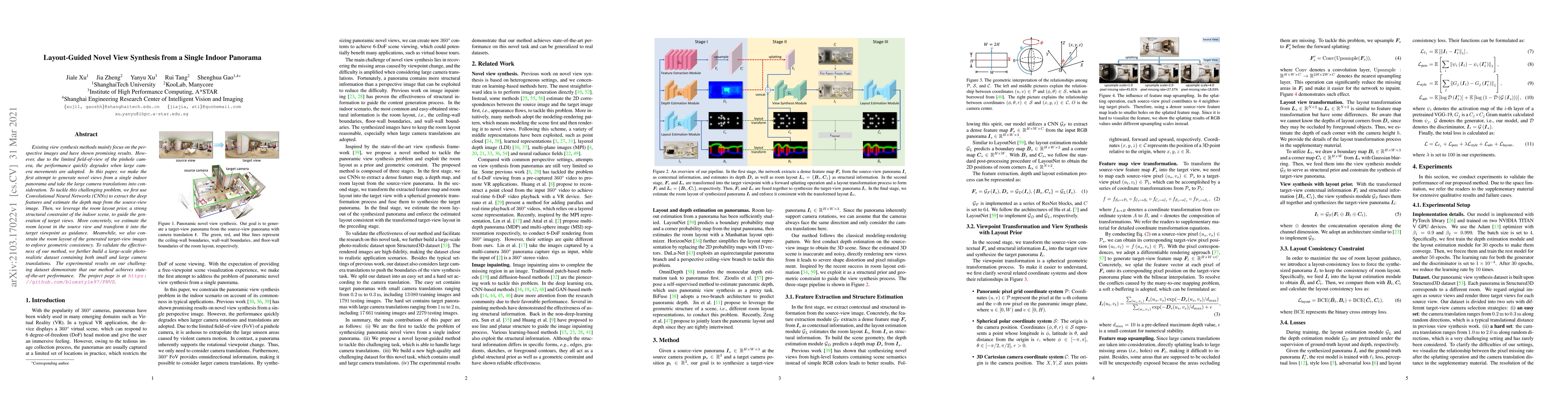 This paper proposes a novel method for synthesizing views from a single indoor panorama, leveraging room layout priors to handle large camera translations. It uses CNNs for feature extraction and depth estimation, and enforces geometric consistency through layout constraints, achieving state-of-the-art results on a newly created dataset.