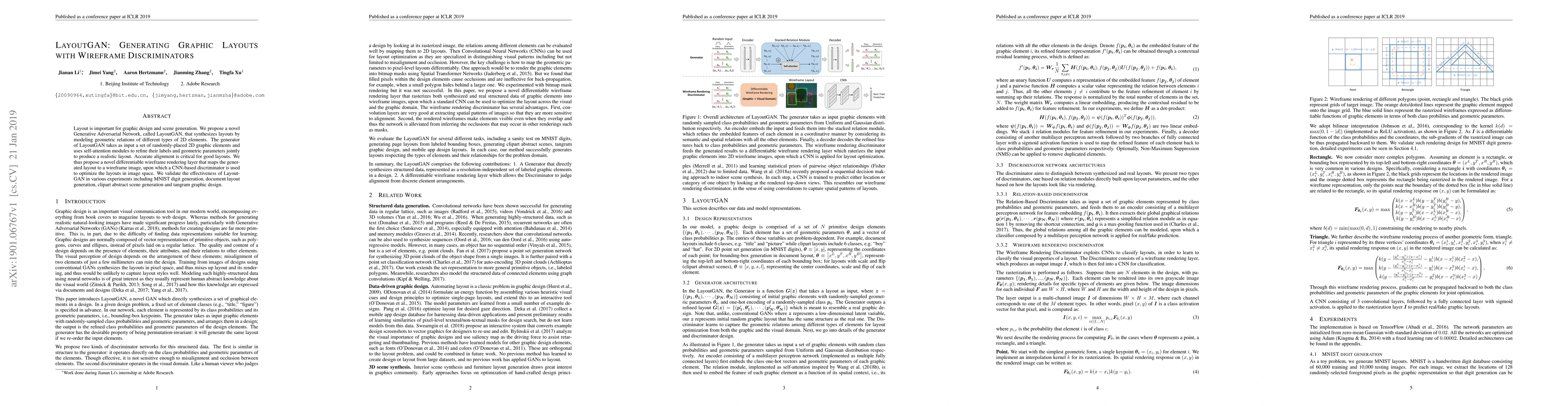 LayoutGAN synthesizes realistic graphic layouts by modeling geometric relations of 2D elements using a novel Generative Adversarial Network with self-attention and a differentiable wireframe rendering layer. Experiments demonstrate its effectiveness in generating layouts for MNIST, documents, clipart scenes, and tangram designs.