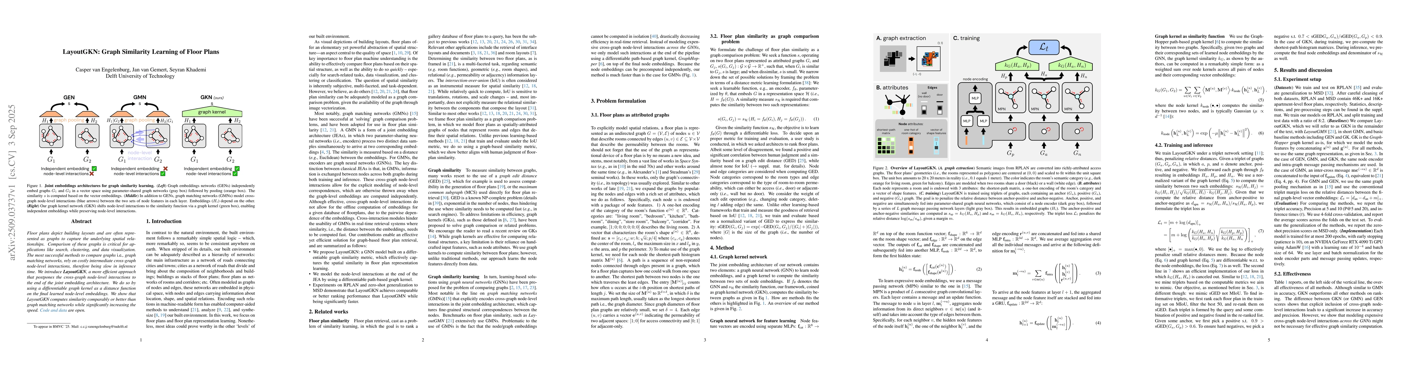 Floor plans depict building layouts and are often represented as graphs to capture the underlying spatial relationships. Comparison of these graphs is critical for applications like search, clustering, and data visualization. The most successful methods to compare graphs \ie, graph matching networks, rely on costly intermediate cross-graph node-level interactions, therefore being slow in inference time. We introduce \textbf{LayoutGKN}, a more efficient approach that postpones the cross-graph node-level interactions to the end of the joint embedding architecture. We do so by using a differentiable graph kernel as a distance function on the final learned node-level embeddings. We show that LayoutGKN computes similarity comparably or better than graph matching networks while significantly increasing the speed. \href{https://github.com/caspervanengelenburg/LayoutGKN}{Code and data} are open.