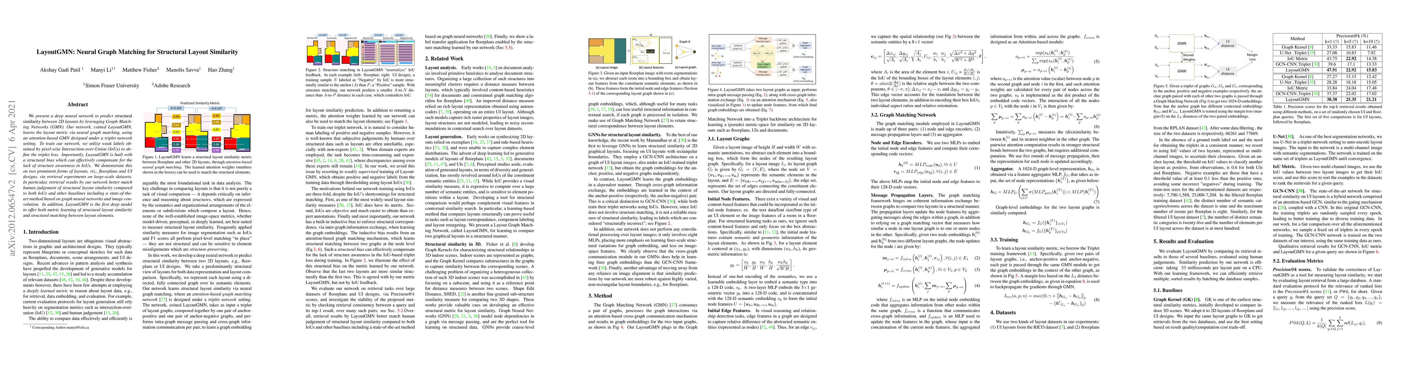 LayoutGMN is a neural network that uses Graph Matching Networks to predict structural similarity between 2D layouts, outperforming traditional IoU metrics and other methods in layout retrieval tasks. It uniquely combines metric learning with structural matching, demonstrating superior performance in matching human judgements of layout similarity.