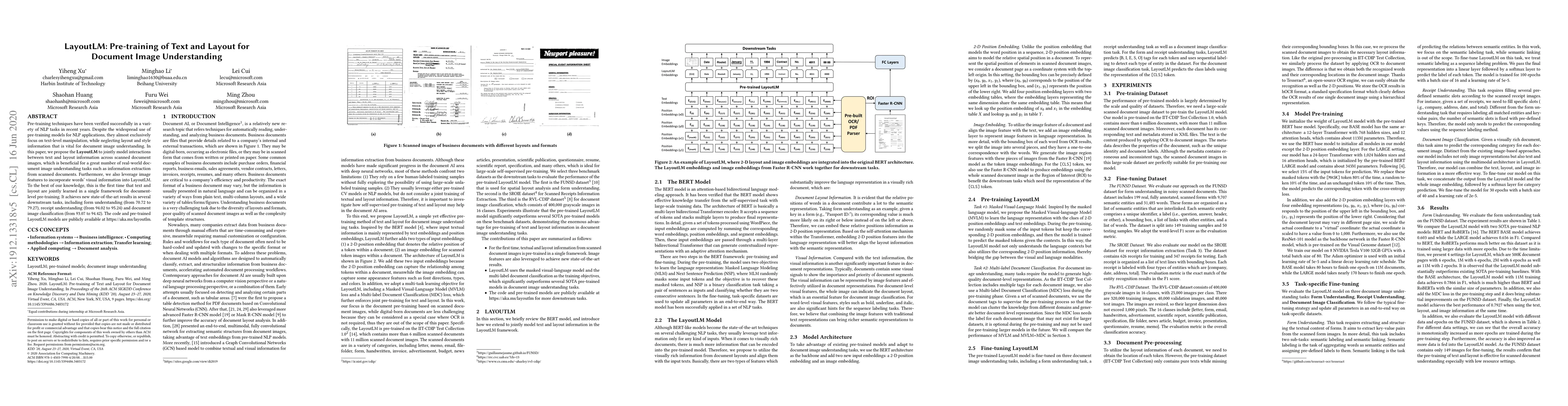 The paper introduces LayoutLM, a novel pre-training framework that jointly models text and layout information in scanned document images, achieving state-of-the-art results in various document understanding tasks by incorporating visual information from images. The approach outperforms existing methods in form, receipt, and document image classification tasks.