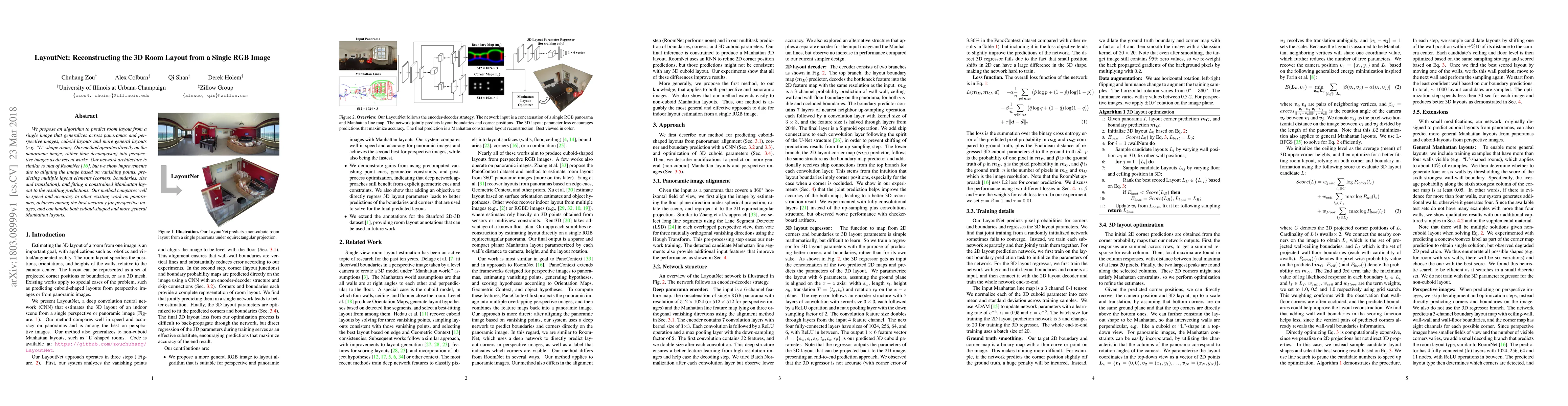 LayoutNet reconstructs 3D room layouts from single RGB images by predicting multiple layout elements and fitting a constrained Manhattan layout, achieving high accuracy and speed across various room shapes. The method outperforms existing techniques by directly operating on panoramic images and handling both cuboid and general layouts.