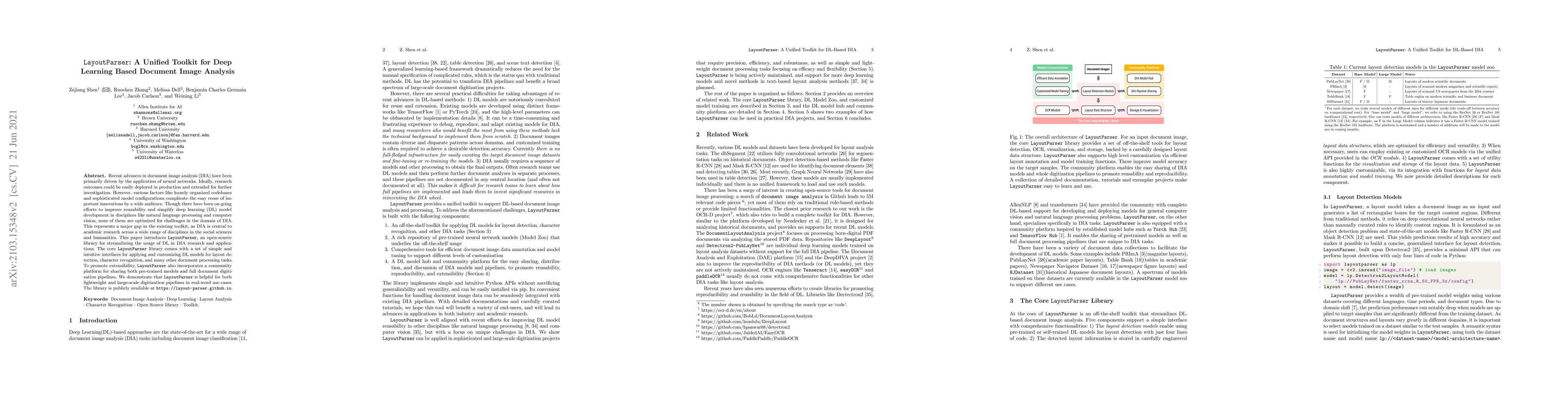 Recent advances in document image analysis (DIA) have been primarily driven by the application of neural networks. Ideally, research outcomes could be easily deployed in production and extended for further investigation. However, various factors like loosely organized codebases and sophisticated model configurations complicate the easy reuse of important innovations by a wide audience. Though there have been on-going efforts to improve reusability and simplify deep learning (DL) model development in disciplines like natural language processing and computer vision, none of them are optimized for challenges in the domain of DIA. This represents a major gap in the existing toolkit, as DIA is central to academic research across a wide range of disciplines in the social sciences and humanities. This paper introduces layoutparser, an open-source library for streamlining the usage of DL in DIA research and applications. The core layoutparser library comes with a set of simple and intuitive interfaces for applying and customizing DL models for layout detection, character recognition, and many other document processing tasks. To promote extensibility, layoutparser also incorporates a community platform for sharing both pre-trained models and full document digitization pipelines. We demonstrate that layoutparser is helpful for both lightweight and large-scale digitization pipelines in real-word use cases. The library is publicly available at https://layout-parser.github.io/.