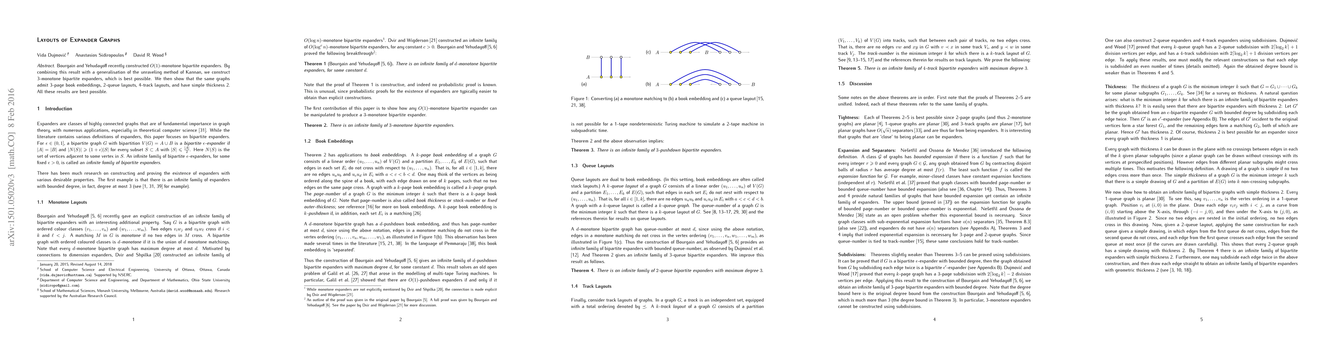 Bourgain and Yehudayoff recently constructed $O(1)$-monotone bipartite expanders. By combining this result with a generalisation of the unraveling method of Kannan, we construct 3-monotone bipartite expanders, which is best possible. We then show that the same graphs admit 3-page book embeddings, 2-queue layouts, 4-track layouts, and have simple thickness 2. All these results are best possible.