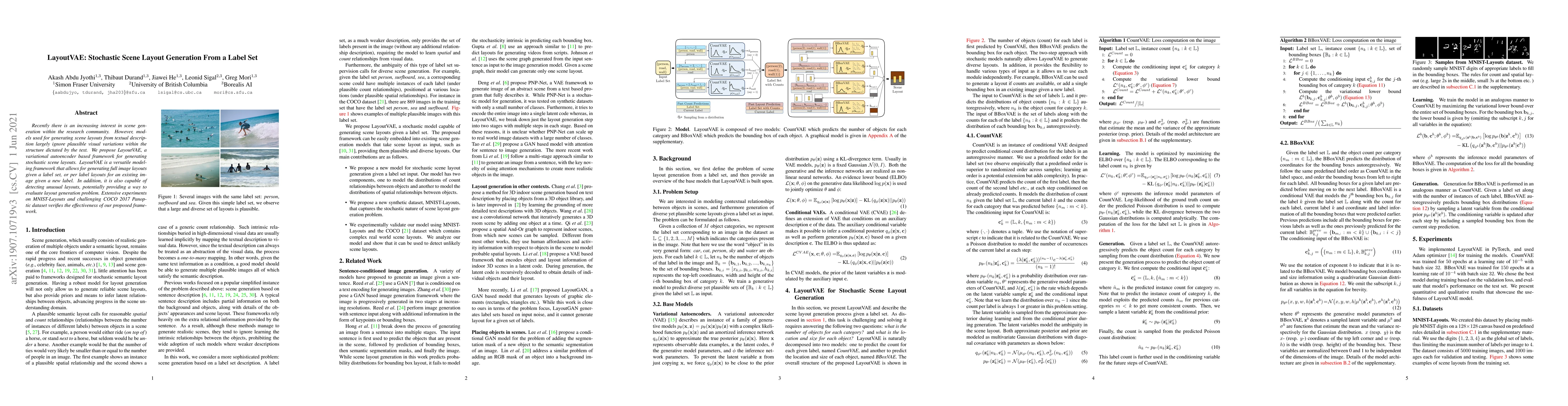 Recently there is an increasing interest in scene generation within the research community. However, models used for generating scene layouts from textual description largely ignore plausible visual variations within the structure dictated by the text. We propose LayoutVAE, a variational autoencoder based framework for generating stochastic scene layouts. LayoutVAE is a versatile modeling framework that allows for generating full image layouts given a label set, or per label layouts for an existing image given a new label. In addition, it is also capable of detecting unusual layouts, potentially providing a way to evaluate layout generation problem. Extensive experiments on MNIST-Layouts and challenging COCO 2017 Panoptic dataset verifies the effectiveness of our proposed framework.