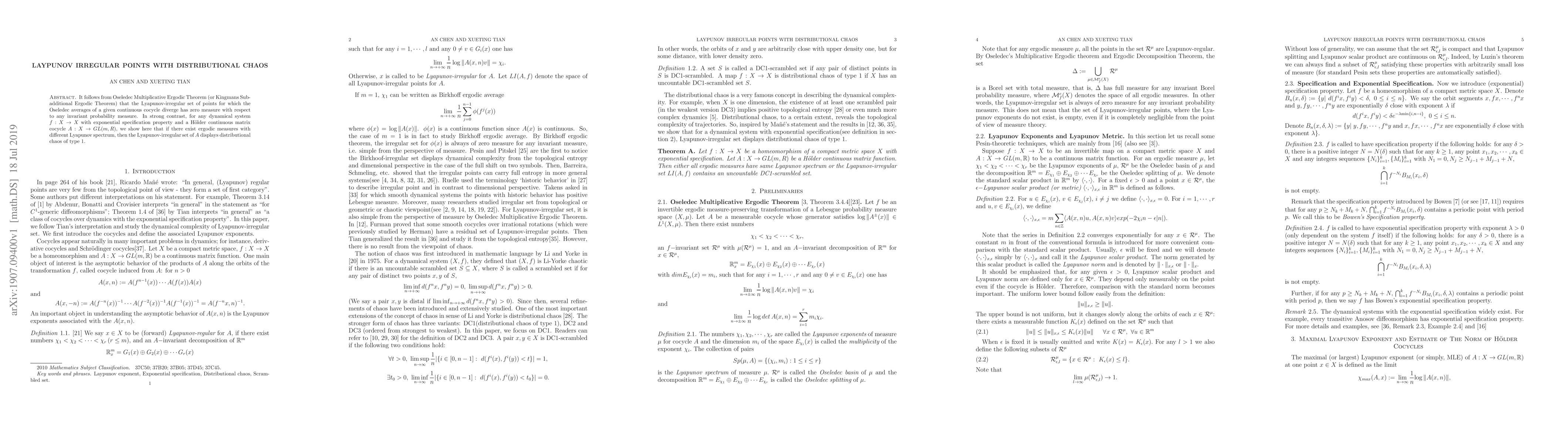 The paper shows that for certain dynamical systems with exponential specification property, Lyapunov-irregular points can exhibit distributional chaos of type 1 when there exist ergodic measures with different Lyapunov spectra. This contrasts with the Oseledec Multiplicative Ergodic Theorem, which states that such sets have zero measure under invariant probability measures.