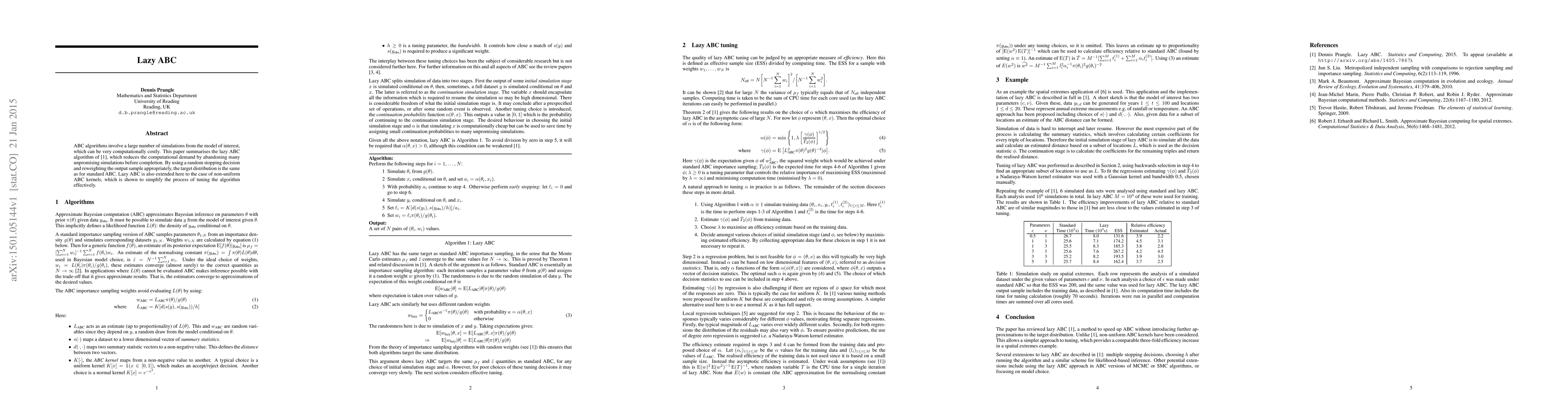 Summary: The paper introduces Lazy ABC, a method that reduces computational costs in ABC algorithms by terminating unpromising simulations early. It maintains the same target distribution as standard ABC through random stopping and reweighting, and extends it to non-uniform kernels, simplifying tuning.