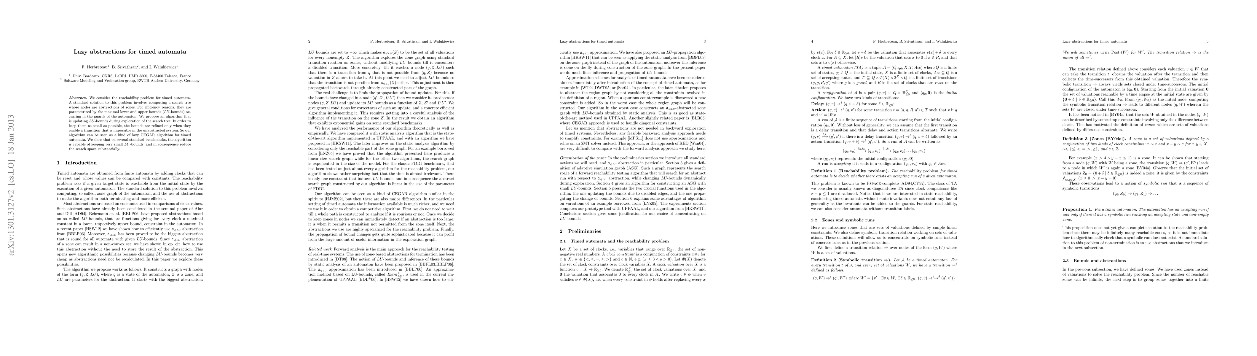 We consider the reachability problem for timed automata. A standard solution to this problem involves computing a search tree whose nodes are abstractions of zones. For efficiency reasons, they are parametrized by the maximal lower and upper bounds (LU-bounds) occurring in the guards of the automaton. We propose an algorithm that is updating LU-bounds during exploration of the search tree. In order to keep them as small as possible, the bounds are refined only when they enable a transition that is impossible in the unabstracted system. So our algorithm can be seen as a kind of lazy CEGAR algorithm for timed automata. We show that on several standard benchmarks, the algorithm is capable of keeping very small LU-bounds, and in consequence reduce the search space substantially.