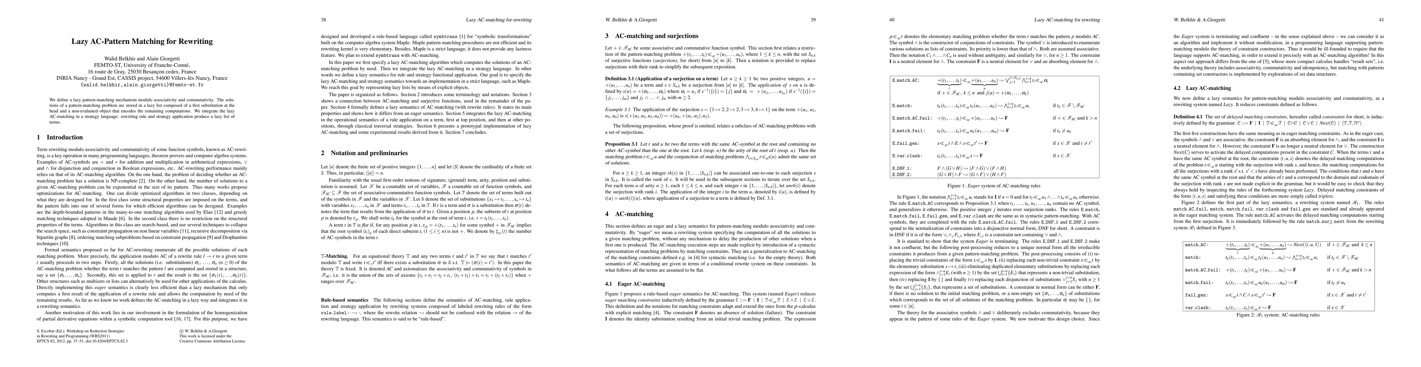 This paper introduces a lazy AC-pattern matching mechanism that efficiently handles associative-commutative matching by storing solutions in a lazy list. This approach integrates within a strategy language where rewriting rules and applications generate terms as a lazy list.