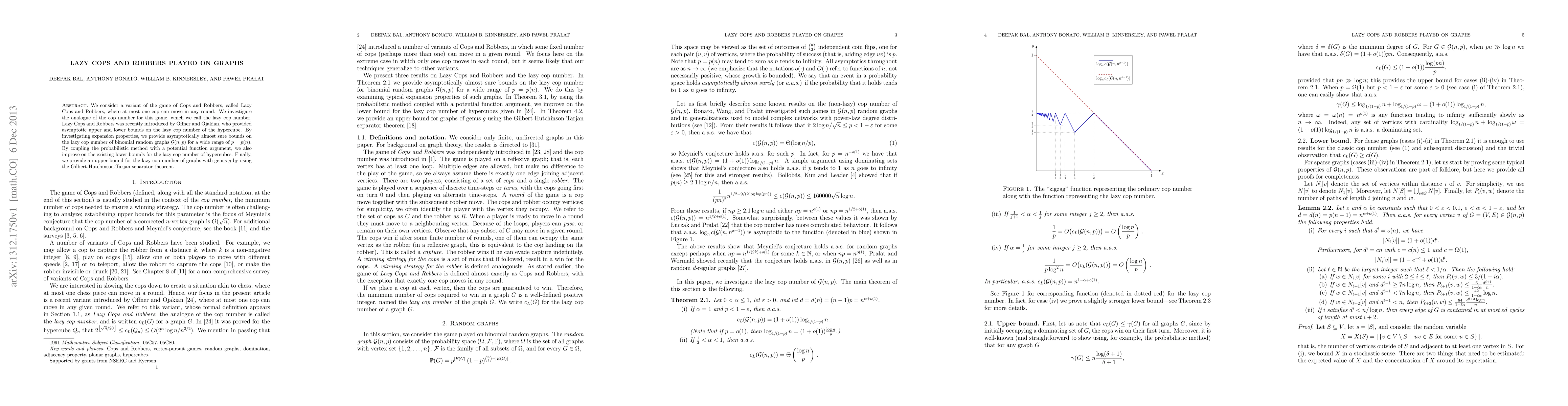 We consider a variant of the game of Cops and Robbers, called Lazy Cops and Robbers, where at most one cop can move in any round. We investigate the analogue of the cop number for this game, which we call the lazy cop number. Lazy Cops and Robbers was recently introduced by Offner and Ojakian, who provided asymptotic upper and lower bounds on the lazy cop number of the hypercube. By investigating expansion properties, we provide asymptotically almost sure bounds on the lazy cop number of binomial random graphs $\mathcal{G}(n,p)$ for a wide range of $p=p(n)$. By coupling the probabilistic method with a potential function argument, we also improve on the existing lower bounds for the lazy cop number of hypercubes. Finally, we provide an upper bound for the lazy cop number of graphs with genus $g$ by using the Gilbert-Hutchinson-Tarjan separator theorem.