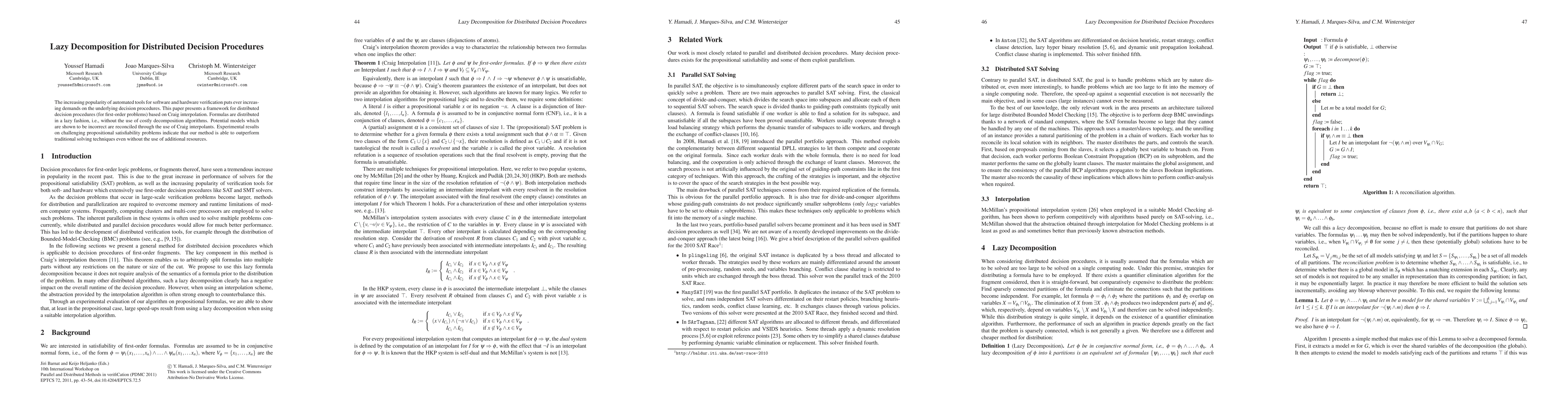 The increasing popularity of automated tools for software and hardware verification puts ever increasing demands on the underlying decision procedures. This paper presents a framework for distributed decision procedures (for first-order problems) based on Craig interpolation. Formulas are distributed in a lazy fashion, i.e., without the use of costly decomposition algorithms. Potential models which are shown to be incorrect are reconciled through the use of Craig interpolants. Experimental results on challenging propositional satisfiability problems indicate that our method is able to outperform traditional solving techniques even without the use of additional resources.