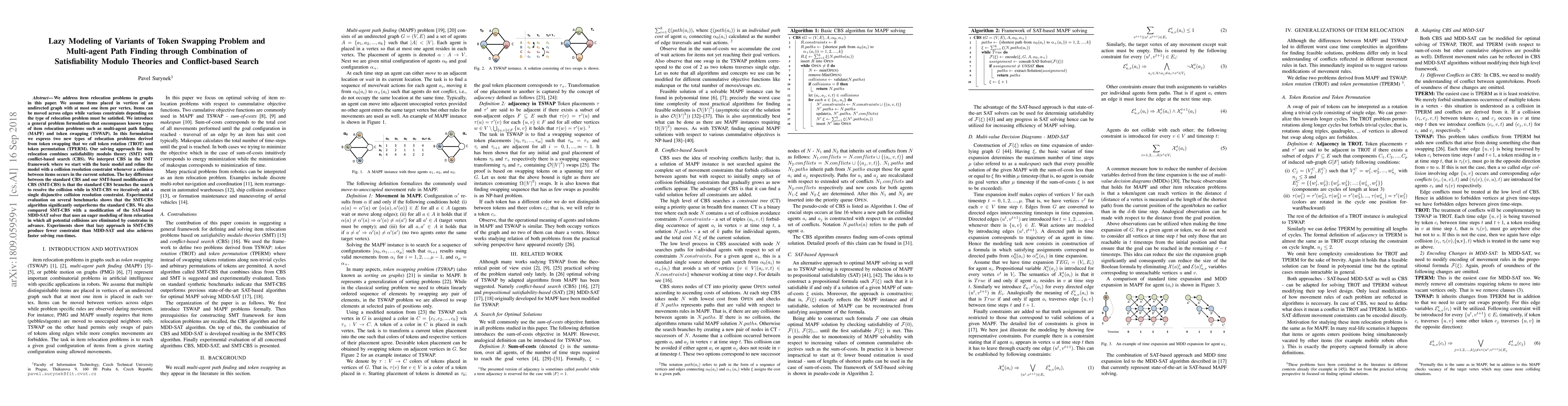 This paper proposes a novel solving approach combining satisfiability modulo theories (SMT) with conflict-based search (CBS) to address item relocation problems in graphs, including multi-agent path finding and token swapping variants. The SMT-CBS method iteratively refines the model with collision resolution constraints, outperforming standard CBS and an eager SAT-based solver in benchmarks.