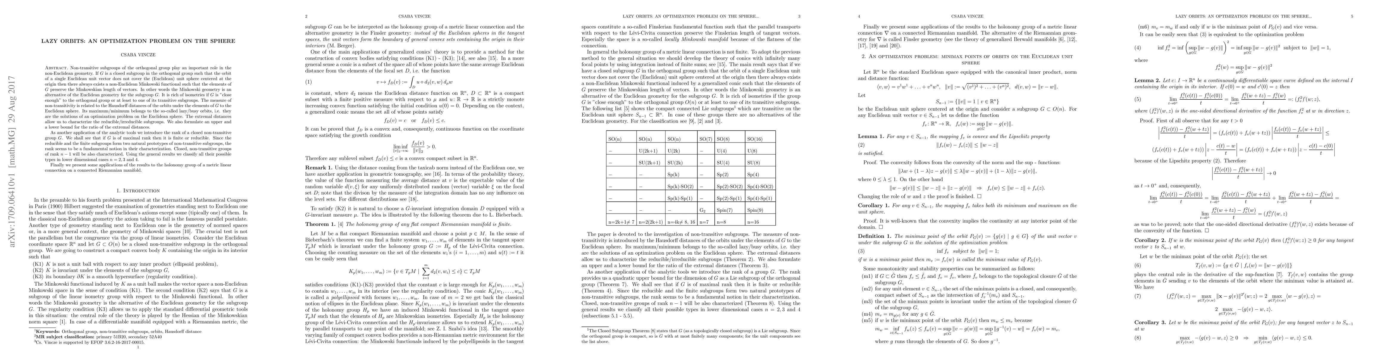 Non-transitive subgroups of the orthogonal group play an important role in the non-Euclidean geometry. If $G$ is a closed subgroup in the orthogonal group such that the orbit of a single Euclidean unit vector does not cover the (Euclidean) unit sphere centered at the origin then there always exists a non-Euclidean Minkowski functional such that the elements of $G$ preserve the Minkowskian length of vectors. In other words the Minkowski geometry is an alternative of the Euclidean geometry for the subgroup $G$. It is rich of isometries if $G$ is "close enough" to the orthogonal group or at least to one of its transitive subgroups. The measure of non-transitivity is related to the Hausdorff distances of the orbits under the elements of $G$ to the Euclidean sphere. Its maximum/minimum belongs to the so-called lazy/busy orbits, i.e. they are the solutions of an optimization problem on the Euclidean sphere. The extremal distances allow us to characterize the reducible/irreducible subgroups. We also formulate an upper and a lower bound for the ratio of the extremal distances. As another application of the analytic tools we introduce the rank of a closed non-transitive group $G$. We shall see that if $G$ is of maximal rank then it is finite or reducible. Since the reducible and the finite subgroups form two natural prototypes of non-transitive subgroups, the rank seems to be a fundamental notion in their characterization. Closed, non-transitive groups of rank $n-1$ will be also characterized. Using the general results we classify all their possible types in lower dimensional cases $n=2, 3$ and $4$. Finally we present some applications of the results to the holonomy group of a metric linear connection on a connected Riemannian manifold.
