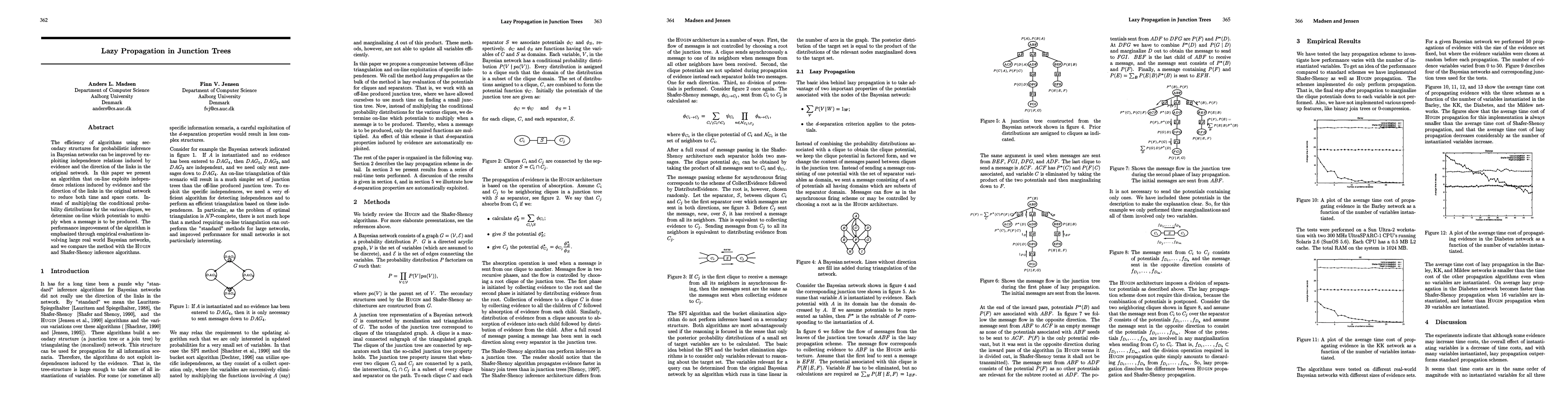 This paper introduces an algorithm for efficient probabilistic inference in Bayesian networks using junction trees, leveraging lazy propagation to reduce computational costs by determining potentials to multiply on-line. Empirical evaluations show significant performance improvements compared to HUGIN and Shafer-Shenoy inference algorithms.