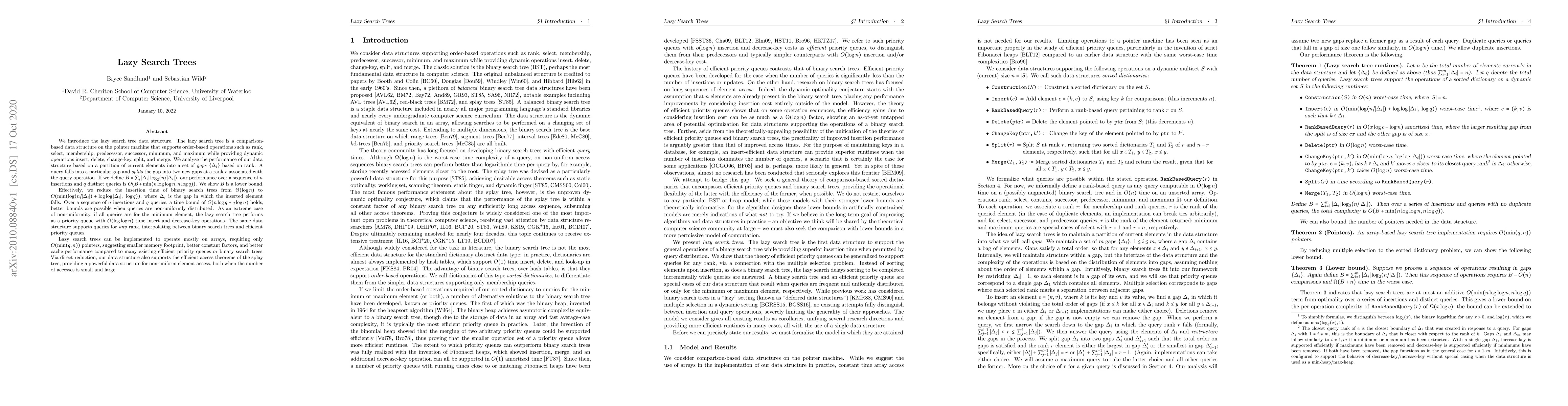 We introduce the lazy search tree data structure. The lazy search tree is a comparison-based data structure on the pointer machine that supports order-based operations such as rank, select, membership, predecessor, successor, minimum, and maximum while providing dynamic operations insert, delete, change-key, split, and merge. We analyze the performance of our data structure based on a partition of current elements into a set of gaps $\{\Delta_i\}$ based on rank. A query falls into a particular gap and splits the gap into two new gaps at a rank $r$ associated with the query operation. If we define $B = \sum_i |\Delta_i| \log_2(n/|\Delta_i|)$, our performance over a sequence of $n$ insertions and $q$ distinct queries is $O(B + \min(n \log \log n, n \log q))$. We show $B$ is a lower bound. Effectively, we reduce the insertion time of binary search trees from $\Theta(\log n)$ to $O(\min(\log(n/|\Delta_i|) + \log \log |\Delta_i|, \; \log q))$, where $\Delta_i$ is the gap in which the inserted element falls. Over a sequence of $n$ insertions and $q$ queries, a time bound of $O(n \log q + q \log n)$ holds; better bounds are possible when queries are non-uniformly distributed. As an extreme case of non-uniformity, if all queries are for the minimum element, the lazy search tree performs as a priority queue with $O(\log \log n)$ time insert and decrease-key operations. The same data structure supports queries for any rank, interpolating between binary search trees and efficient priority queues. Lazy search trees can be implemented to operate mostly on arrays, requiring only $O(\min(q, n))$ pointers. Via direct reduction, our data structure also supports the efficient access theorems of the splay tree, providing a powerful data structure for non-uniform element access, both when the number of accesses is small and large.