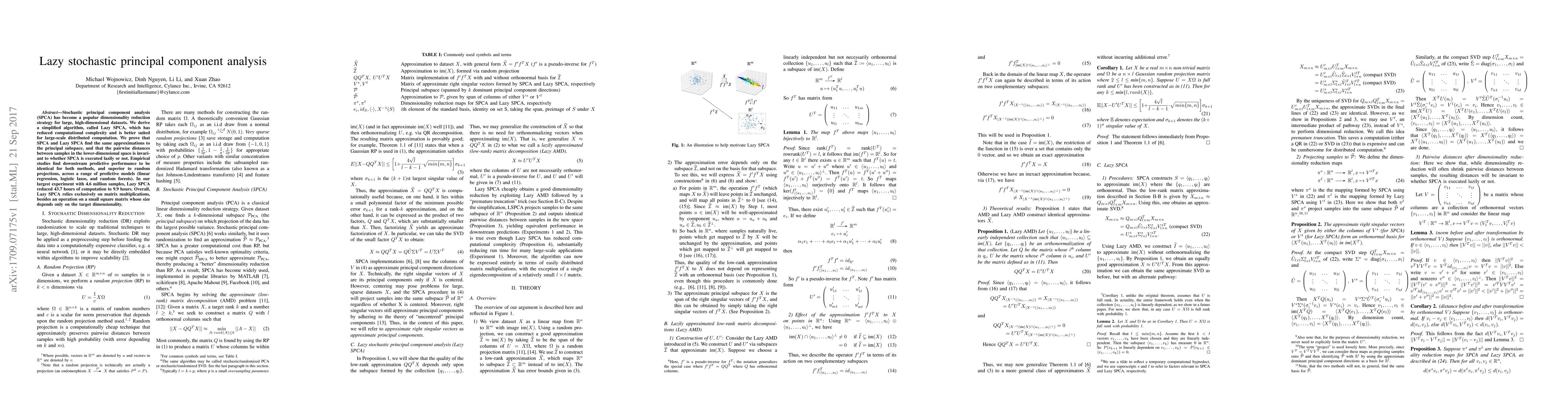 Lazy SPCA simplifies stochastic principal component analysis (SPCA) for large-scale, distributed computation, maintaining the same principal subspace approximations and predictive performance. It significantly reduces computation time, as shown in experiments with 4.6 million samples.